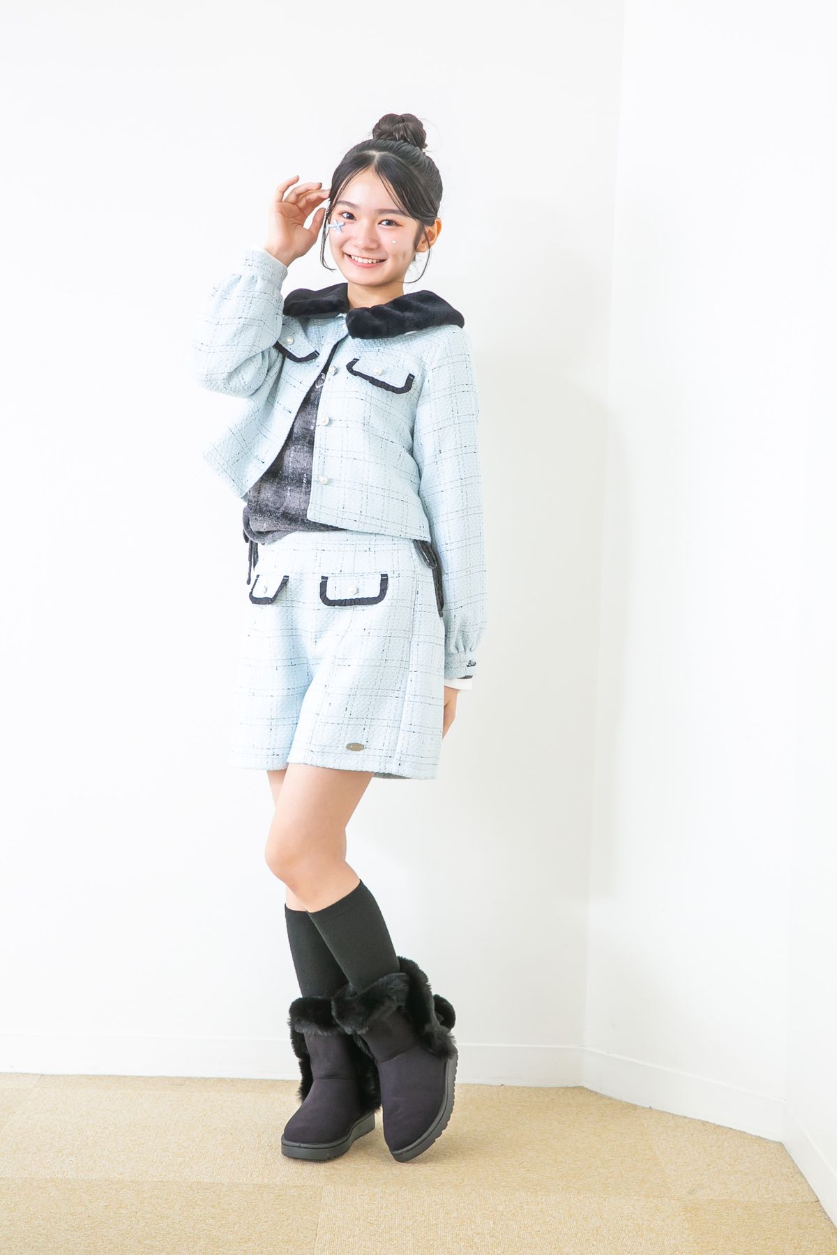 短時間で青のツイードを見つけたのはお見事。ガーリーにまとめたのもGOOD♪