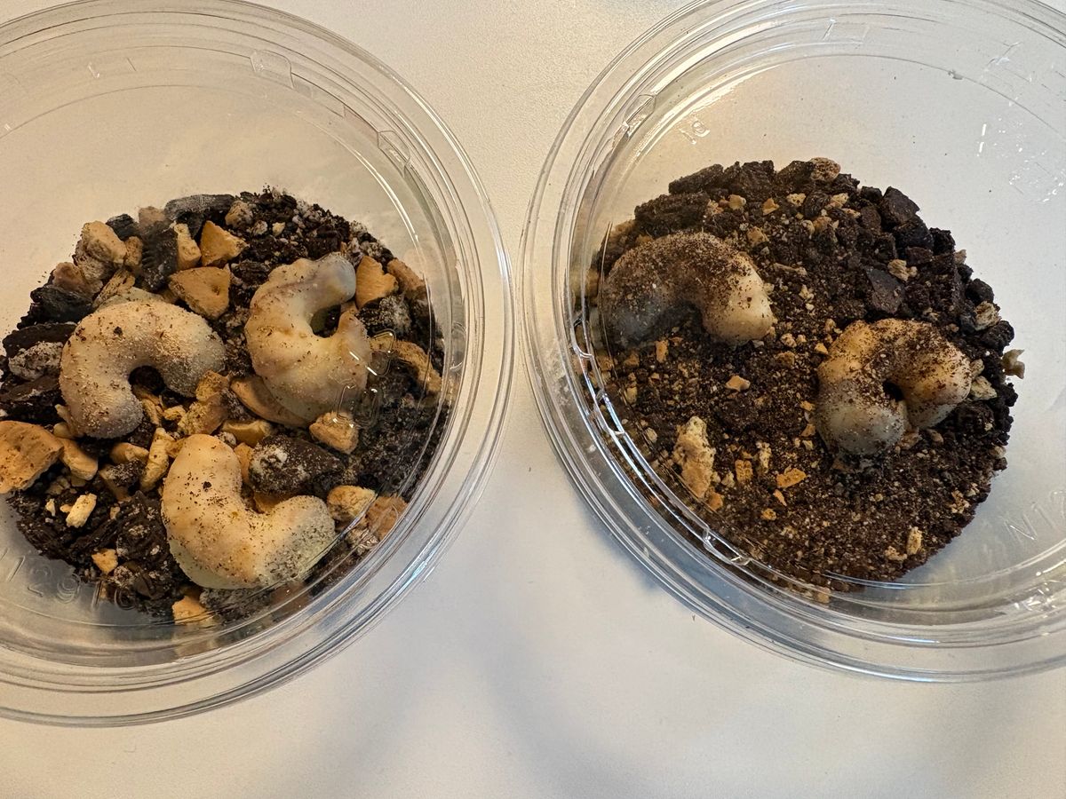 虫は、湯煎で溶かした板チョコでキャラメルコーンをコーティング✨下の土は、オレオとビスケットでカンタンに美味しく作れるよ!ただ、かなりリアルな虫が完成するから要注意!🐛🐛🐛
