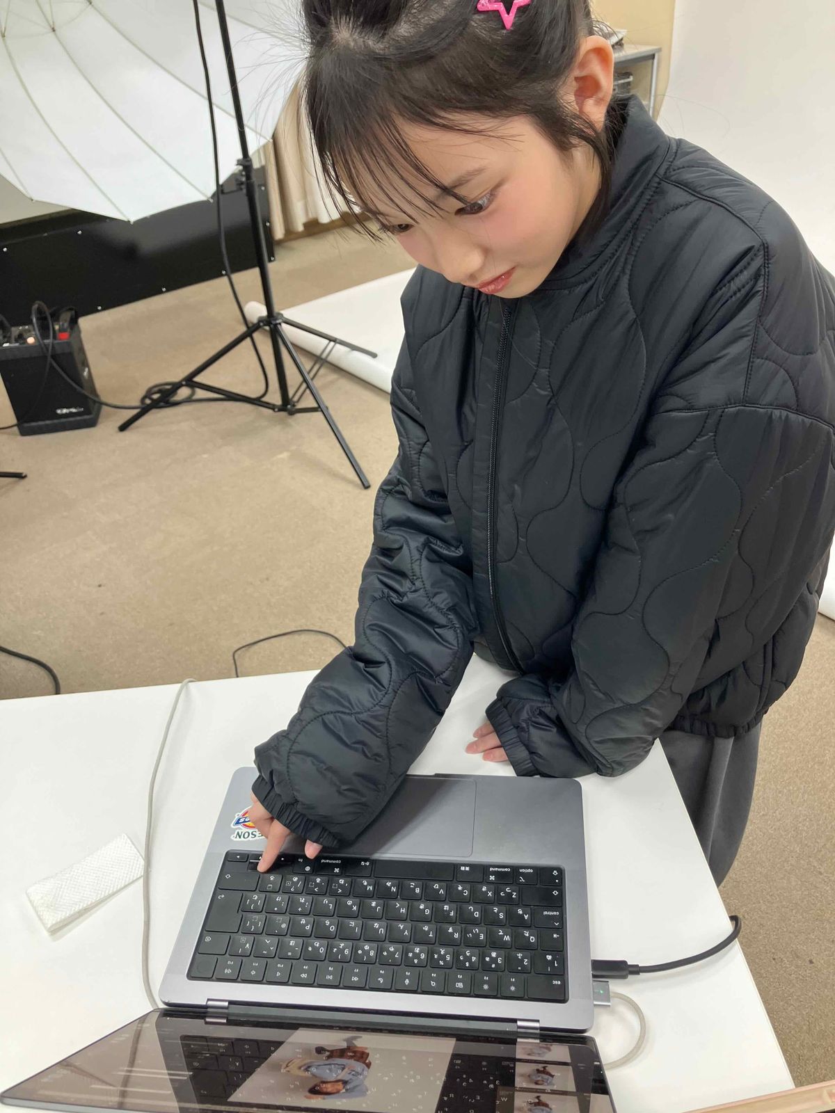 自分のカットをしんけんにチェックするもも。表情やポージングなどの練習にいかしてるのかな?