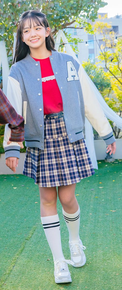 スタジャンとチェックのプリーツスカートは、スクールガールの定番。赤のさし色でコーデが一気にはなやかに♡リサ☆ヘアピンセット¥440/ラティス ソックス¥1320/バイ ラビット