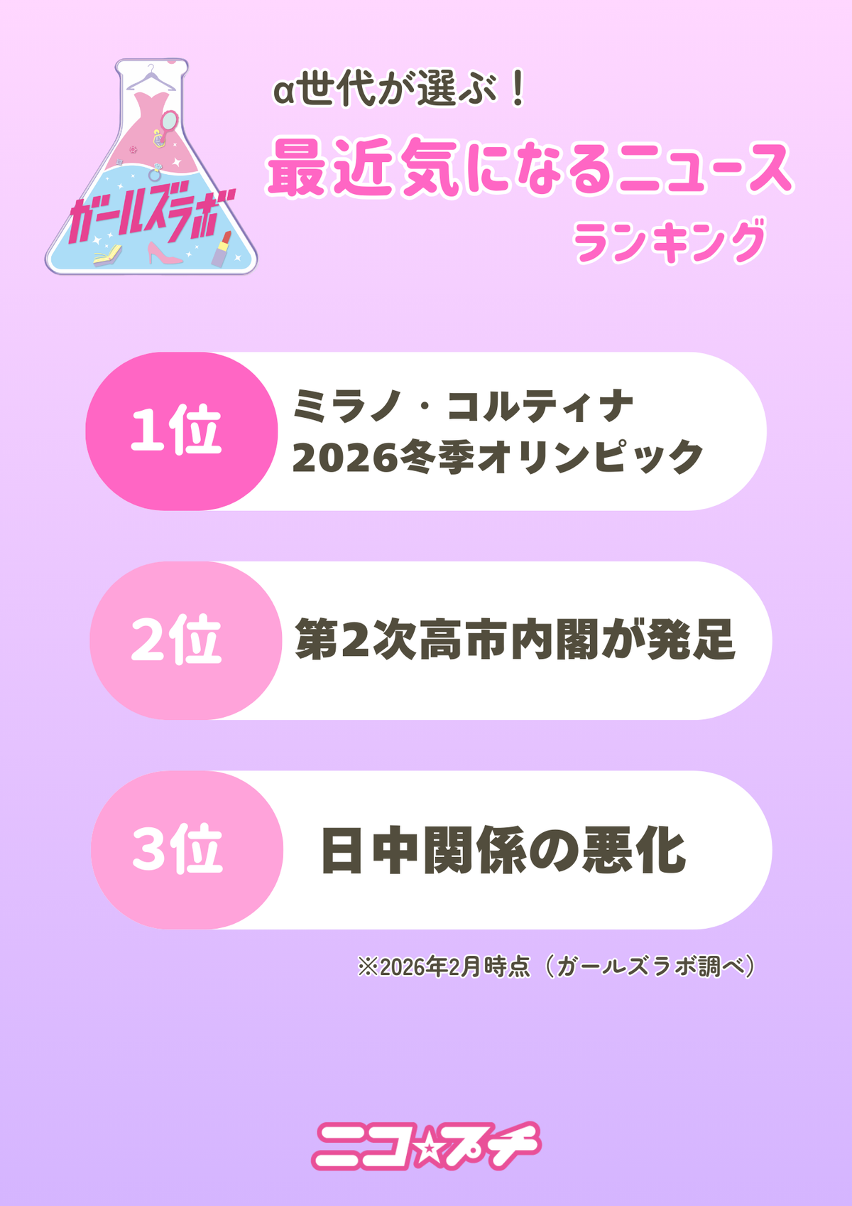 1位はやっぱり連日大盛り上がりのオリンピックだよね。みんな見てるー? 2位は先日の選挙で発足した高市総理の内閣の話!