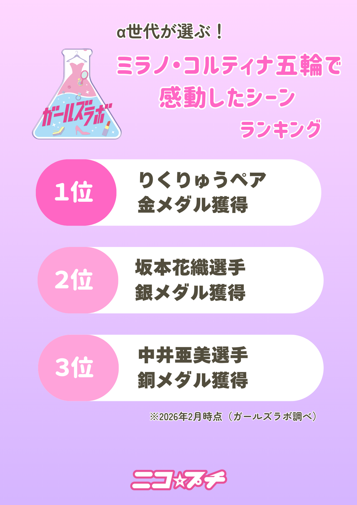1位はフィギュアスケート・ペアで日本で初めての金メダルを獲得したりくりゅうペア。2位、3位ともにフィギュアスケート女子シングルでメダルを獲得した坂本選手と中井選手がランクイン!