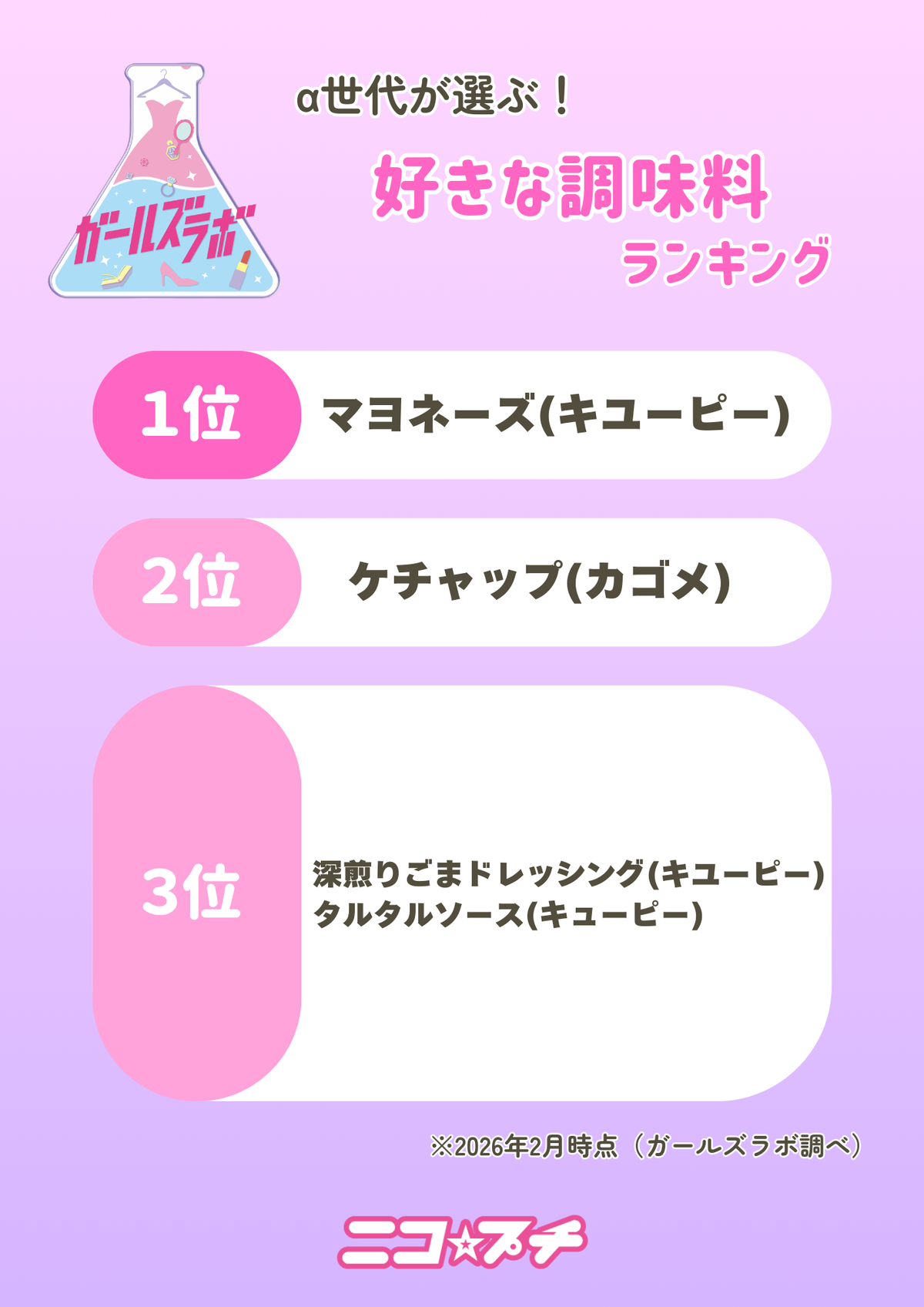 11位は調味料の王者・キユーピーのマヨネーズ。たくさん味の種類があるから、たまには味変するのもいいかも!? 同じくα世代が大好きなケチャップはカゴメのものがランクイン!