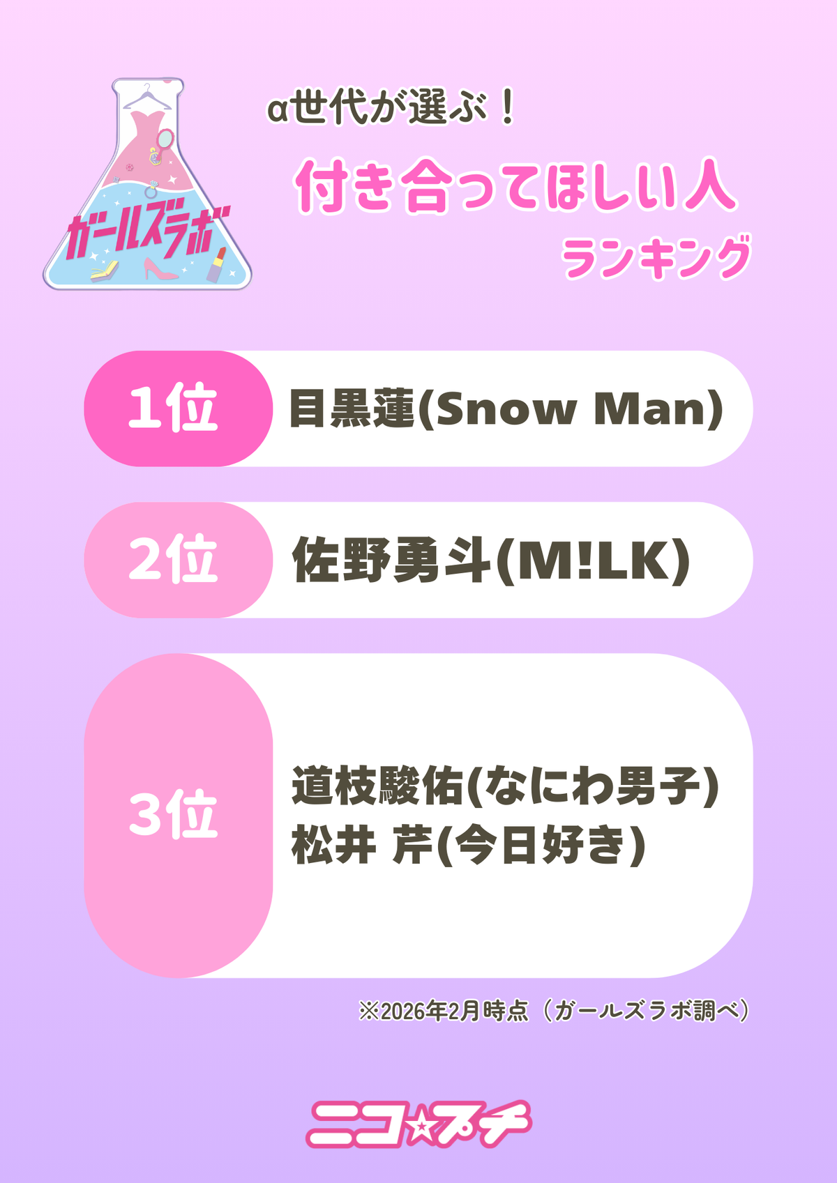 【α世代のトレンドランキング2月編】小中学生の「付き合いたい芸能人」は1位 目黒 蓮(Snow Man)、2位 佐野 勇斗(M!LK)/ミラノ・コルティナ五輪で感動したのはやっぱり「りくりゅうペアの金メダル」♡