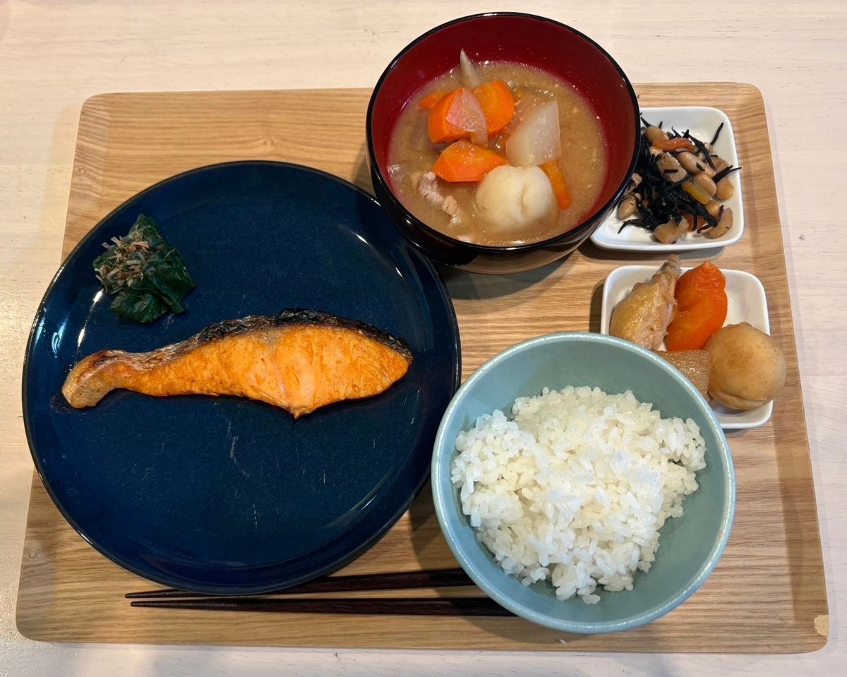 メニュー:鮭、煮物、豚汁、ひじき、ほうれん草のおひたし、ご飯