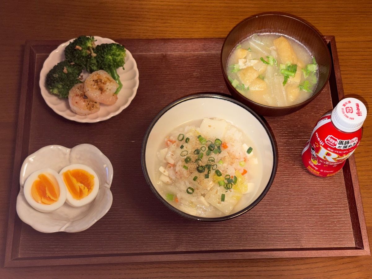 メニュー:野菜の中華粥、お味噌汁、ゆで卵、ガーリックシュリンプ、R-1