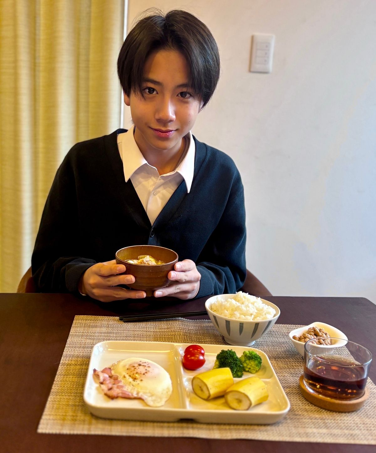 紹介:「洋食より和食を食べるように心がけているので、お米とお味噌汁は毎朝食べているよ。調味料と塩分は少なめにしているところがこだわり。納豆は身長を伸ばすために毎日欠かせない!」