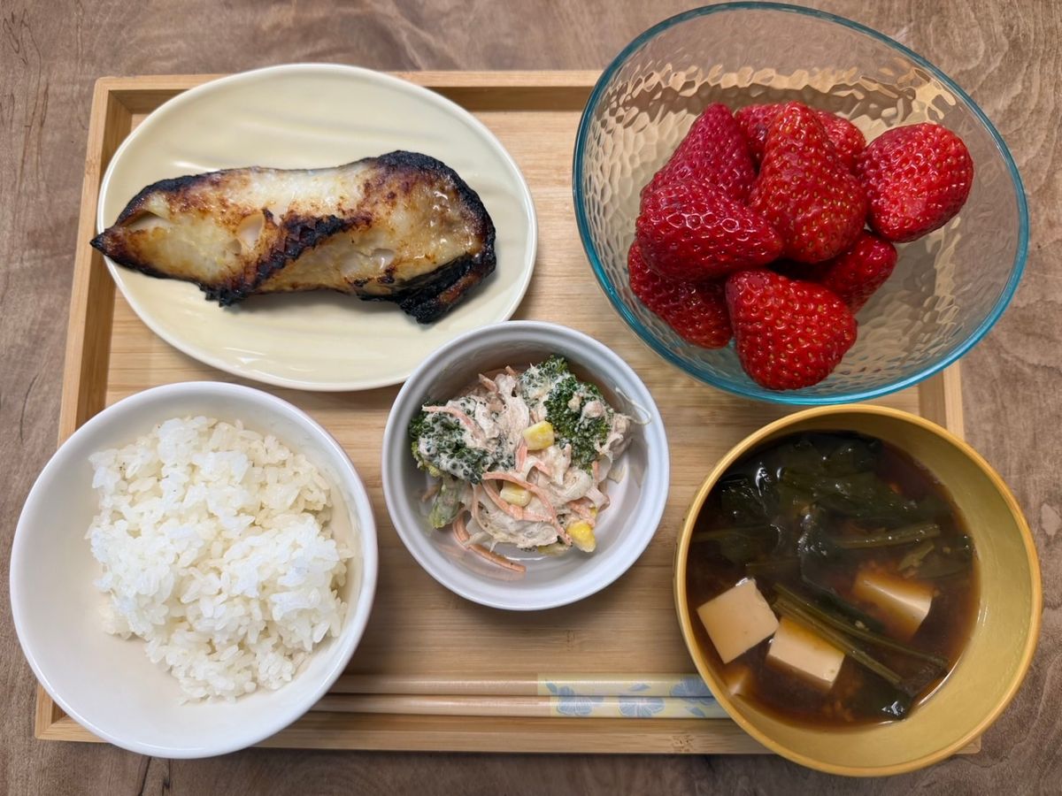 メニュー:ご飯、ほうれん草と豆腐の味噌汁、銀だらの西京焼き、サラダ、いちご
