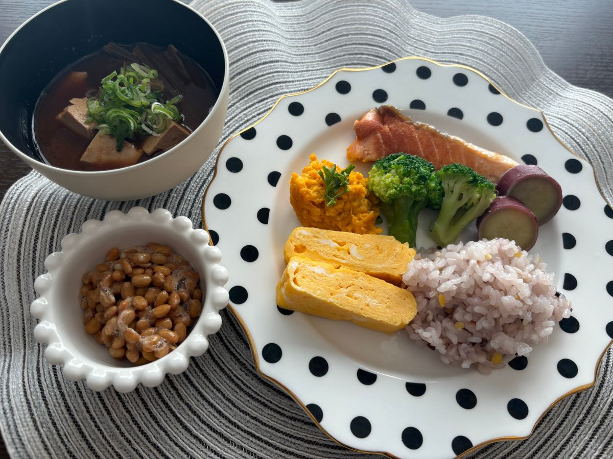 メニュー:十六穀米、鮭、卵焼き、かぼちゃサラダ、蒸したさつまいも、ブロッコリー、納豆、お味噌汁