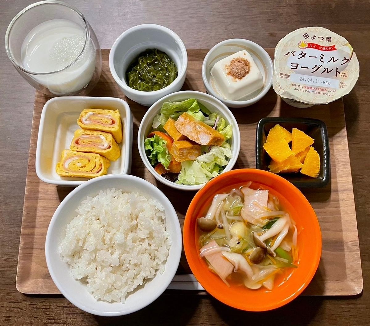 メニュー:白米、コンソメスープ、卵焼き、野菜、もずく、冷奴、みかん、ヨーグルト、牛乳