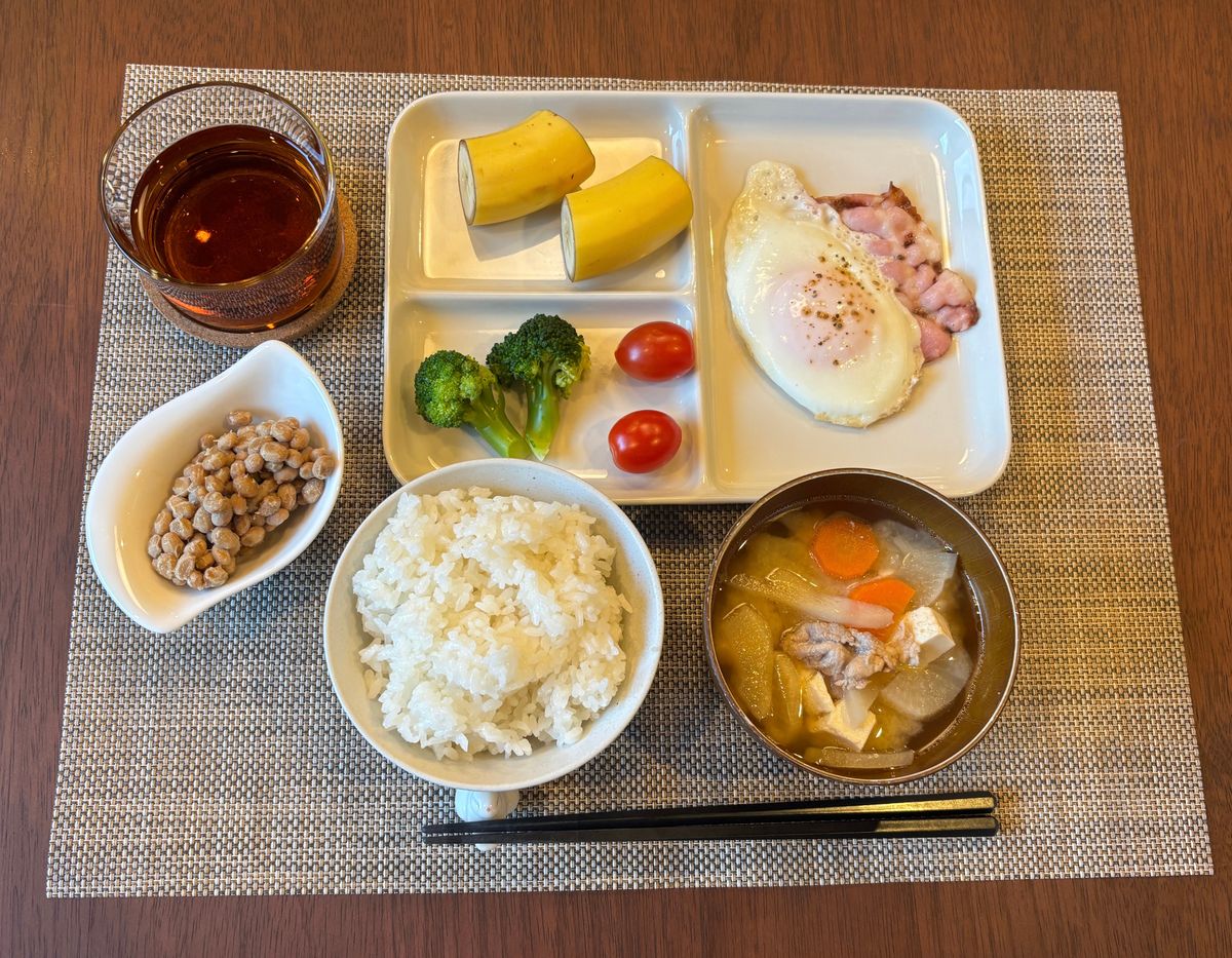メニュー:ごはん、納豆、半熟の目玉焼き、豚汁、ブロッコリー、トマト、バナナ