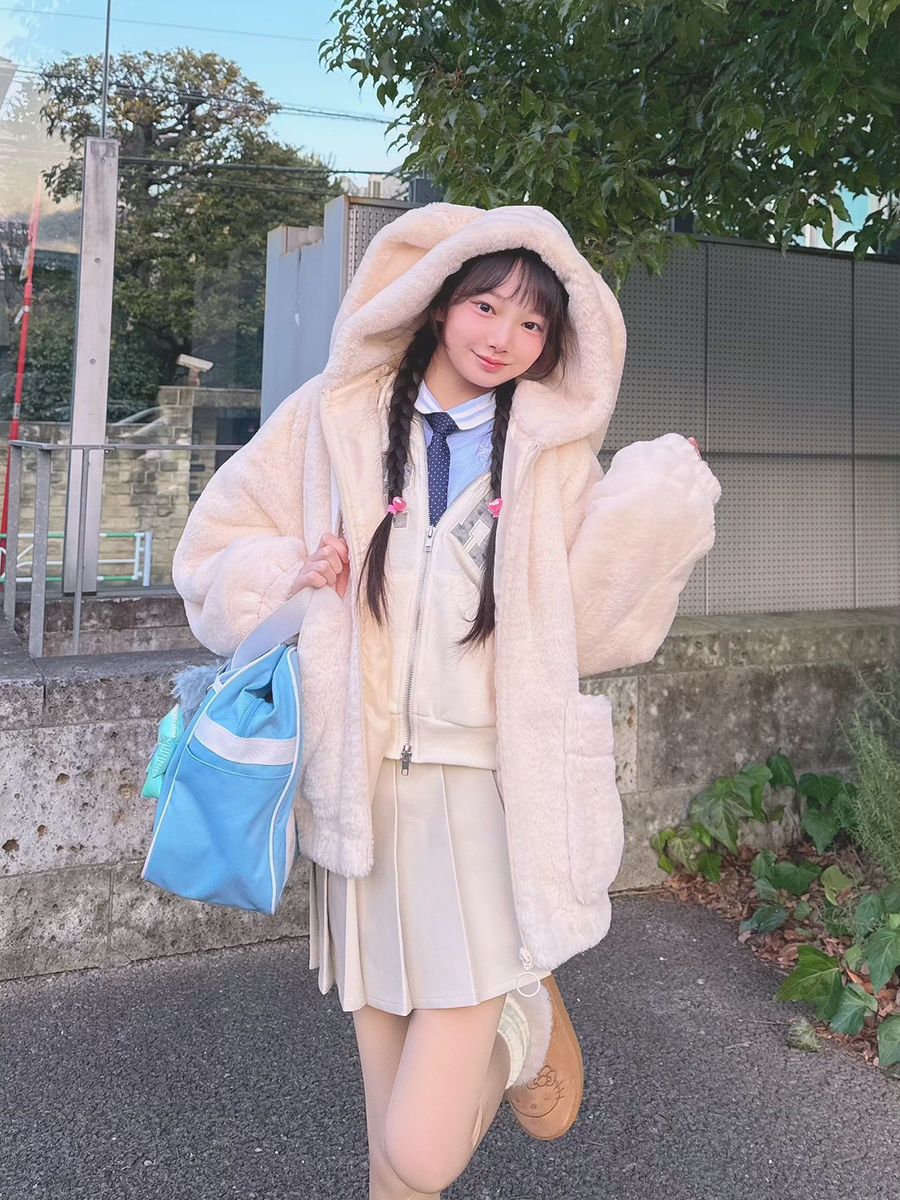 海外風スクールガールコーデがテーマ! ポイントはポロシャツにネクタイを合わせたところ♡ 寒い日でもタイツとくしゅくしゅソックスとムートンを合わせて、かわいさとあたたかさも花マルなコーデにしたよ!\ フードをかぶってもかわいいよ❤︎ /