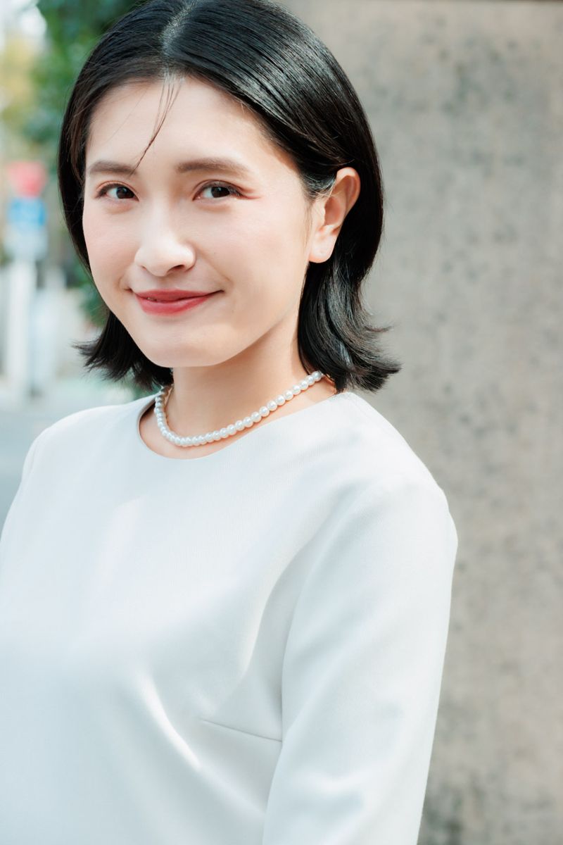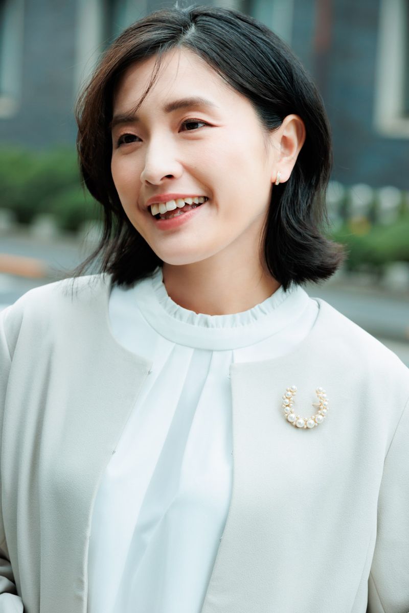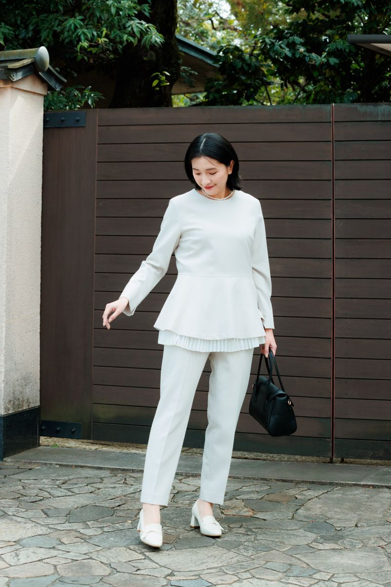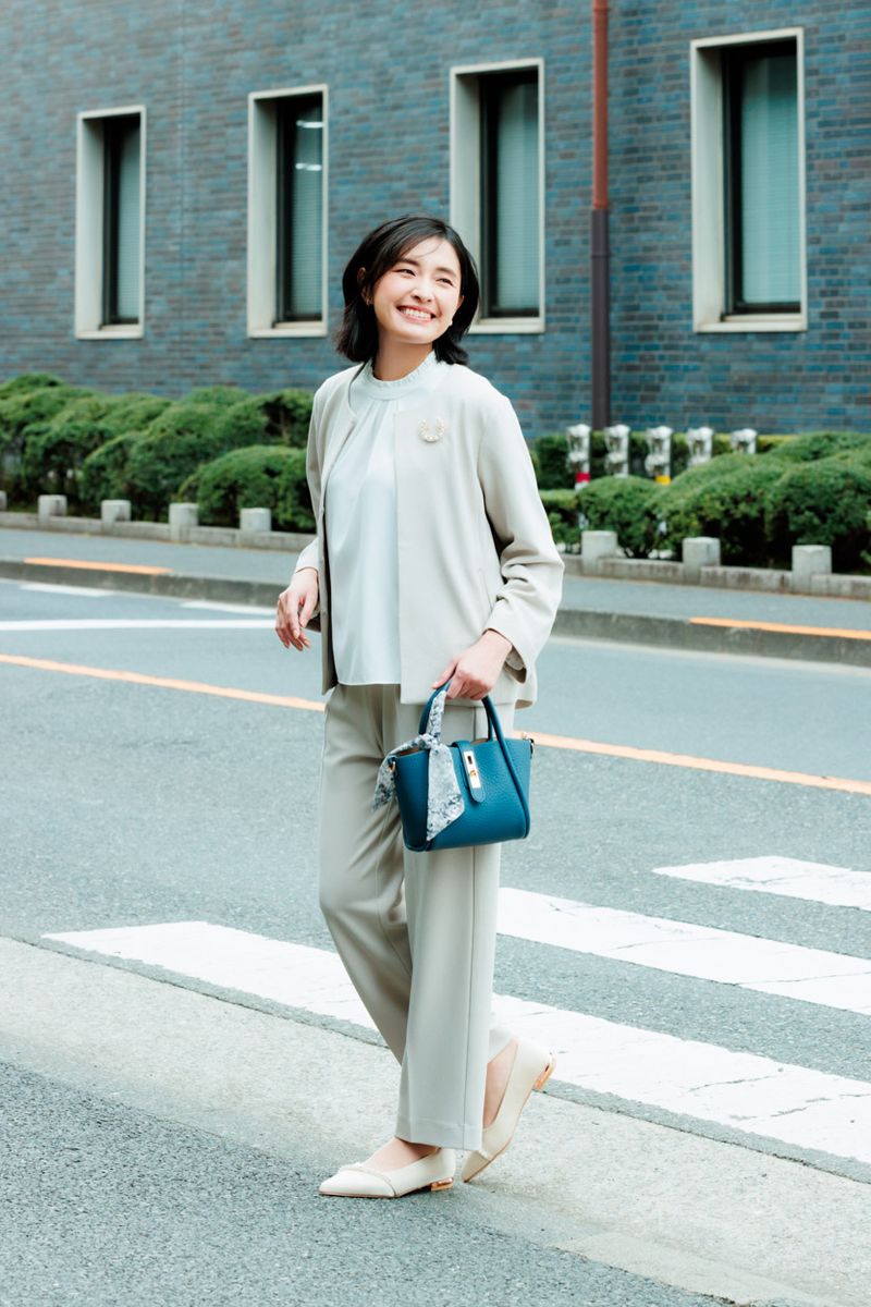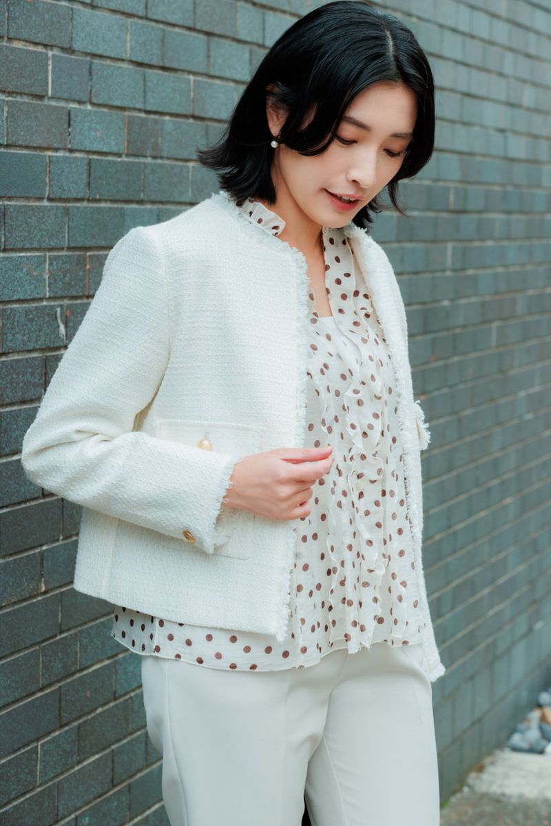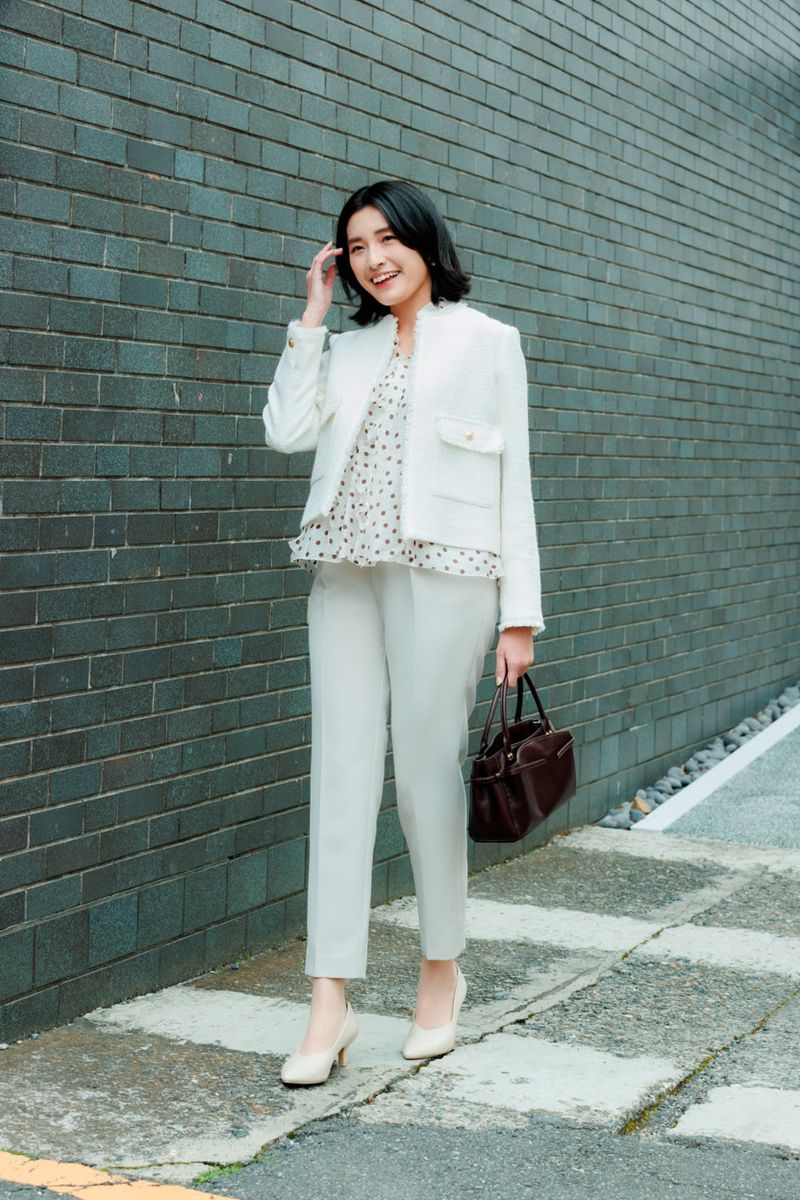 節目の日にふさわしいさわやかなホワイトのツイードジャケットを主役に、春らしさ満点のパンツスタイル。明るいベージュカラーのパンツはテーパードシルエットで、腰回りや太ももにはゆとりがあり動きやすく、足首見せでスタイルアップも上々。インナーにはブラウンのドット柄がやわらかな印象のブラウスをあわせて、パンツスタイルながら大人かわいい雰囲気に。