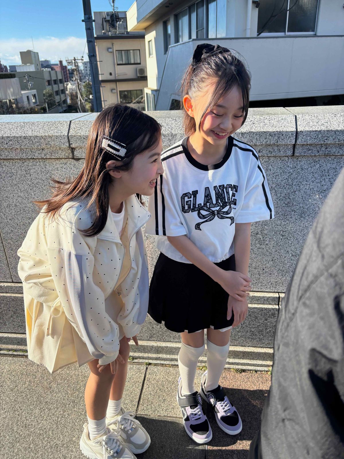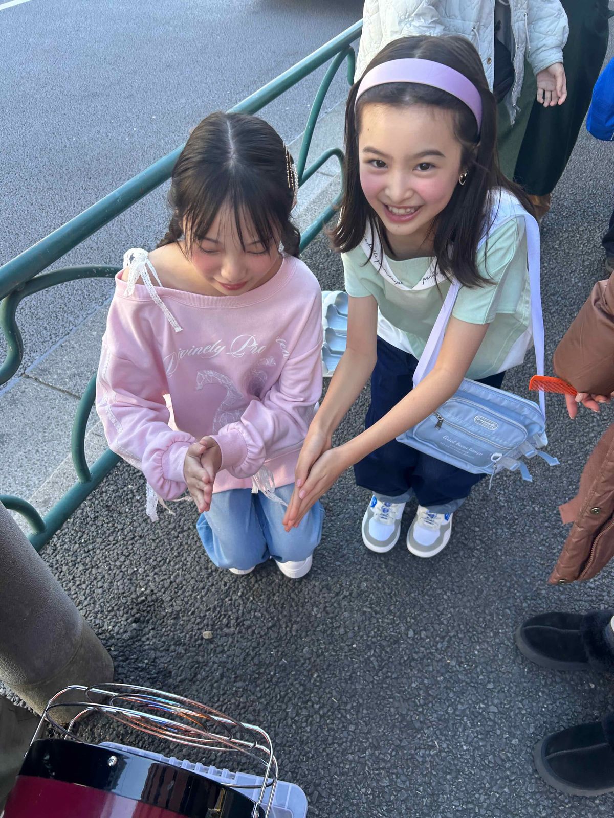 半そでやミニスカートのありすとセイラ。ヒーターのほかに、カイロやジャンパーで寒さをしのいだよ!