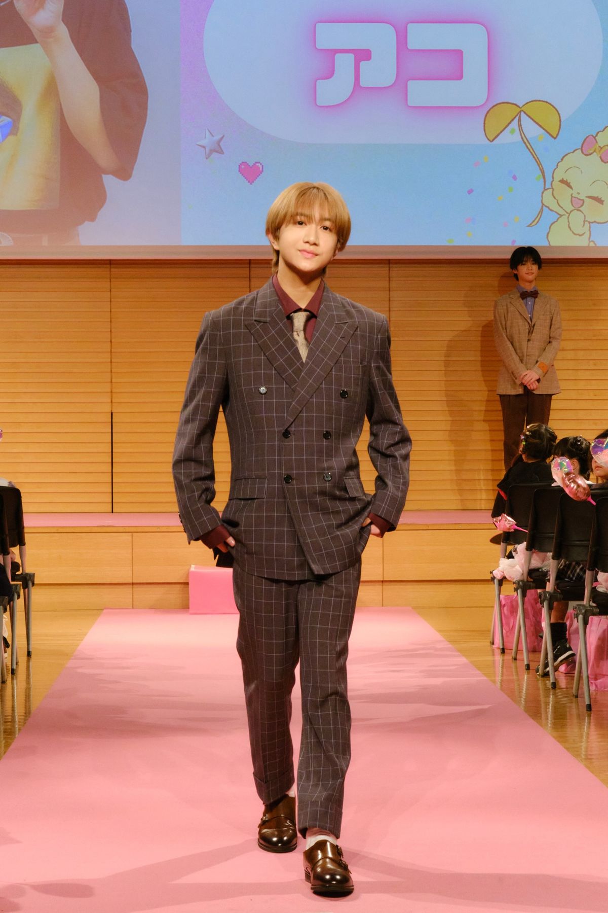 シックなダブルのスーツと、アコの金髪のギャップにきゅん☆ エンジやゴールドなど、こなれた色づかいがおしゃれ。