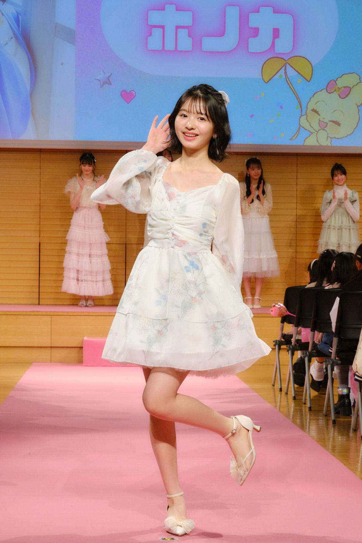 純白にあわい花柄が散りばめられたドレスは、シルエットもはなやか。ホノカのトレードマークのボブヘアには、大きなリボンがかざられていたよ♪