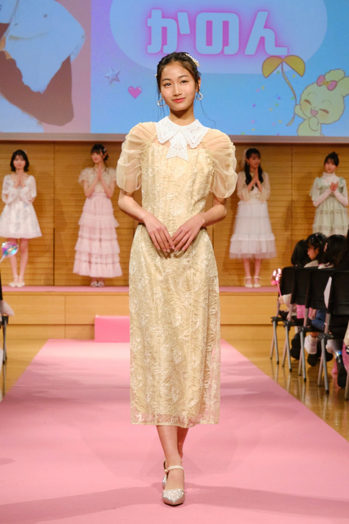 レースでできたドレスは、大人っぽいシルエと春らしいイエローが印象的。クールに見えて、明るく元気なかのんのイメージにリンクしていたよ!
