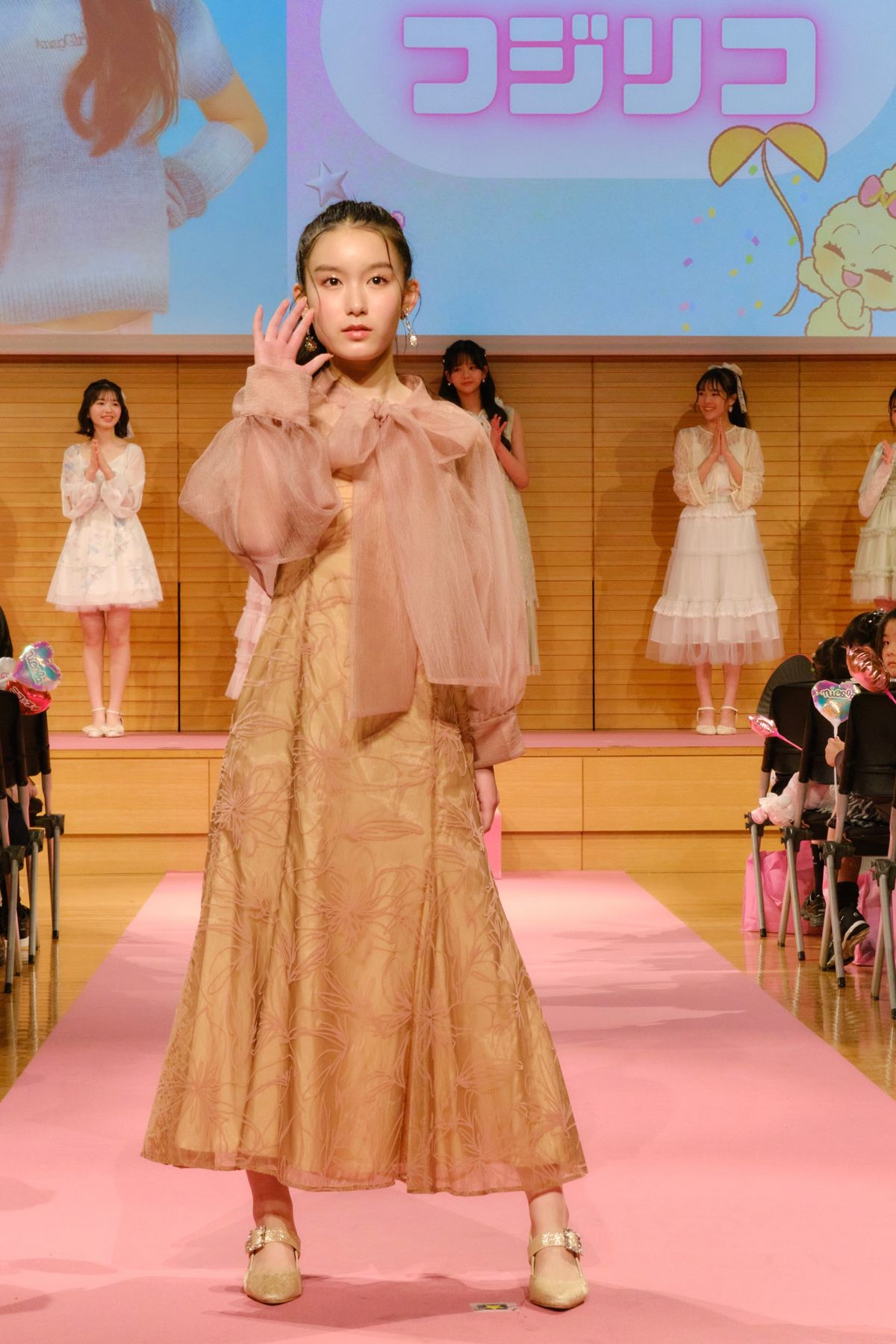 くすみピンクのシックなロングドレスを着たフジリコ。まるで舞台挨拶に登場した女優さんのようなオーラがあふれてる♡