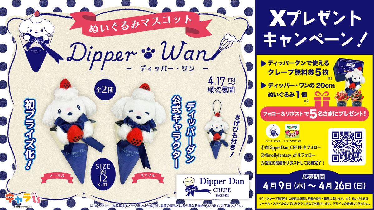 4月17日(金)から、ディッパー・ワンのぬいぐるみマスコットが、クレーンゲームのプライズになるよ♪ ふわふわの素材でできていて、さわりごこちも最高♡