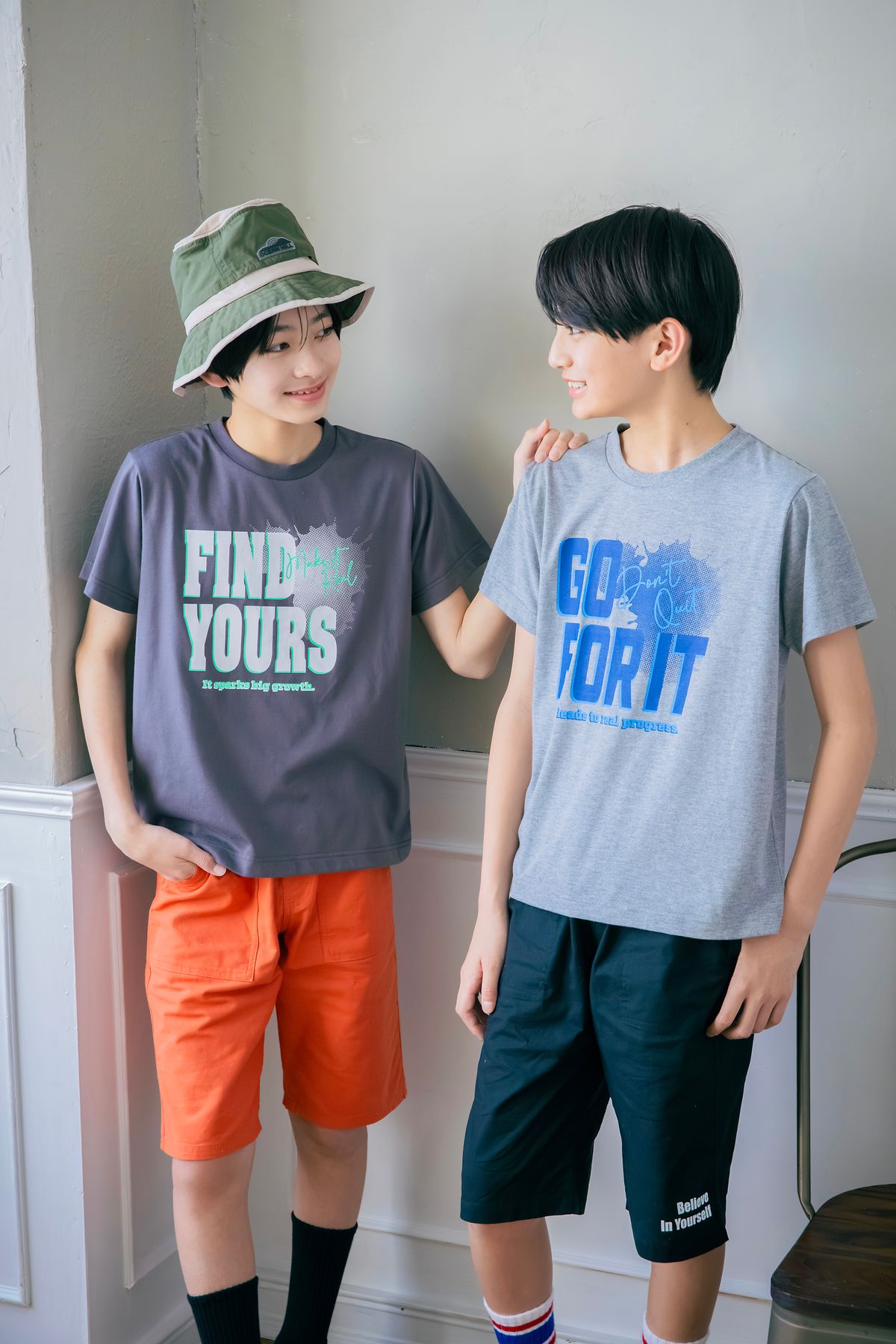 グレーやブラックでまとめることで、大人っぽさがぐっとアップ! ブルーのロゴが映えて、シンプルだけど洗練されたスタイルに仕上がるよ。ユウト☆Tシャツ¥427(140cm~160cm)、ハーフパンツ¥757(140cm~160cm)/ともに西松屋