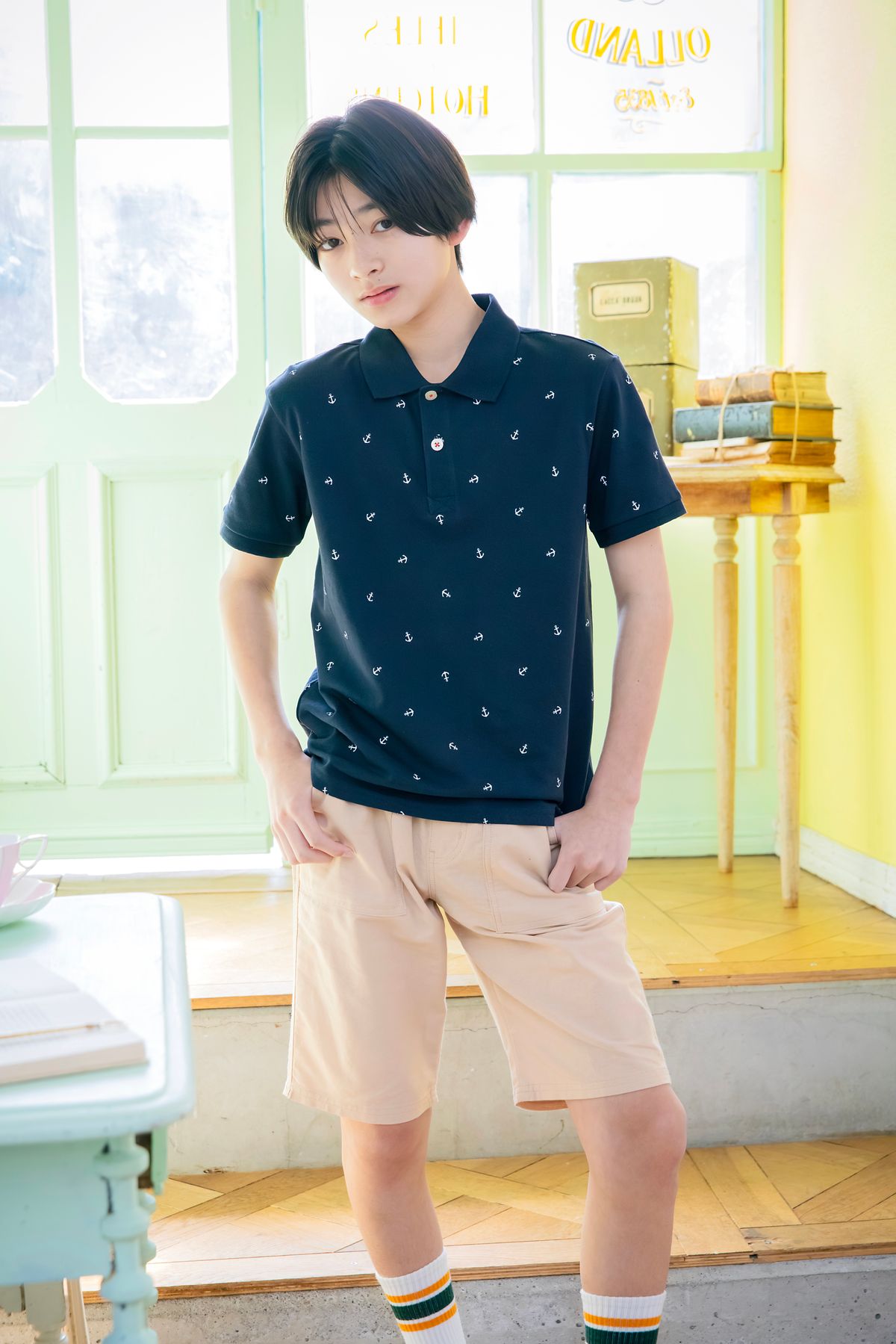 ネイビーのマリン柄ポロにベージュパンツを合わせた、上品で好印象な着こなし。落ち着いた雰囲気と季節感をバランスよく取り入れて、夏のおしゃれを楽しもう!レンスケ☆ポロシャツ¥1087(140cm~160cm)、ハーフパンツ¥757(140cm~160cm)/ともに西松屋