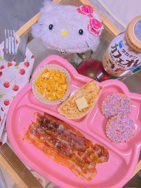 もものこだわりはベーコン🥓❣️ママが作るより、もっとカリカリにしたくて自分で焼いたよ!このスプリングのクッキーも、しっとり感とバターと卵の風味がふんわりで、見た目以上においしいの❣️まるでパンケーキ🥞みたいな味がするクッキー✨カルディに売ってるからぜひ試してみてね❣️