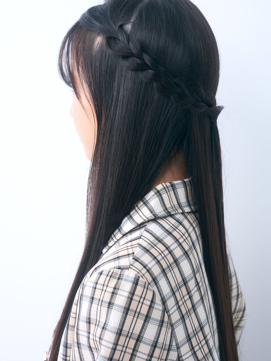 HOW TO両サイドの耳前の髪をとってみつあみを後ろで1つにまとめ、ゴムで結んだら完成!