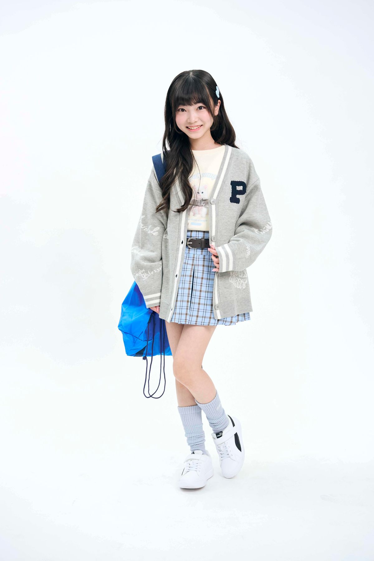 ブルー×グレーで清楚な姉っぽスクールコーデの出来上がり♪ カジュアルだけどオーバーサイズのカーデがさりげないあざとさを演出♡