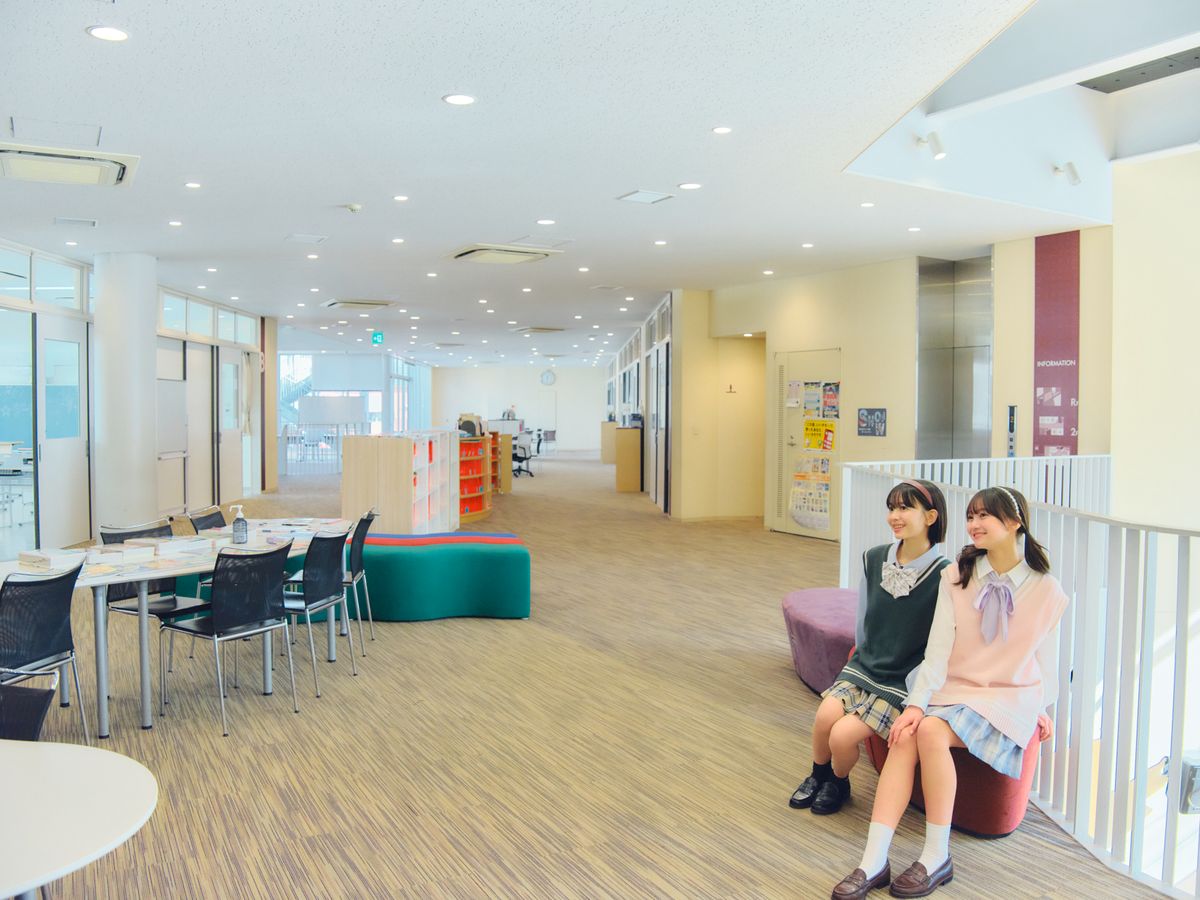 新館LADYの2階、ろうかみたいなこの空間は「ロビー」と呼ばれているよ。新館LADYの中はろうかがないつくりで、空間がぞんぶんに有効活用されているんだ! 参考書がぎっしりつまった本棚やテーブル、カラフルなソファが並んでいて、友だちとのコミュニケーションもばっちりとれそう。