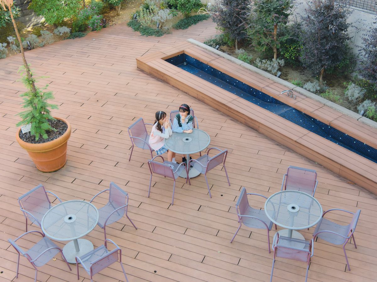 しばふと木の板でできたあたたかみのある屋上は出入り自由。ニコ☆プチ春号の表紙や、卒㋲企画のメインカットを撮影したのもこの屋上だよ! スカイツリーも見える、生徒いこいの場所!