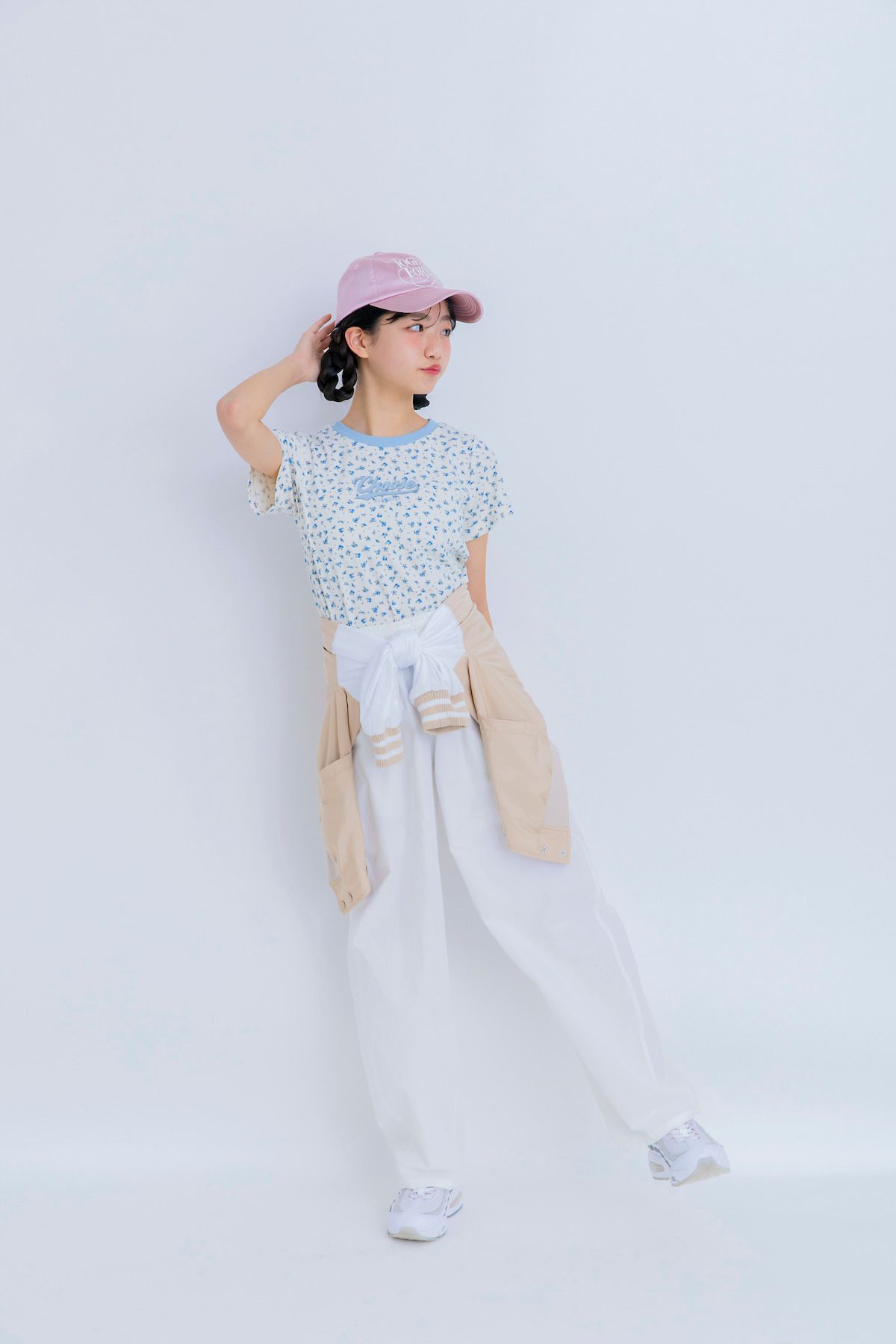 かっこよくなりがちなスタジャンも、ブルーの小花柄Tシャツ&ピンクキャップの効果でカジュガーリーへとアプデ。ミア☆スタジャン¥5489/アムリールガール Tシャツ¥2420/ピンク ラテ パンツ¥1990/ジーユー キャップ¥3080/ラティス スニーカー¥24200/ナイキ スポーツウェア