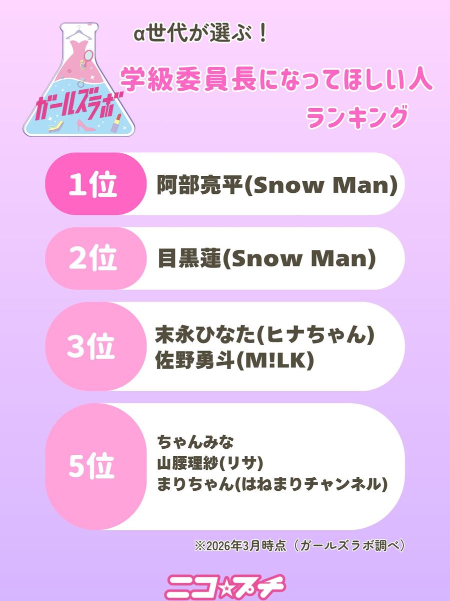 ティーンのためのプロジェクト『ガールズラボ』では、毎月1日に現役小中学生に聞いたトレンドをお届けしているよ。α(アルファ)世代と言われている現役小中学生のガールズラボ会員の、「付き合ってほしい人」「お兄ちゃんになって欲しい人」お父さんになって欲しい人」などを大大大調査! みんなの推しはランクインしているかな? 今日は2026年3月のアンケート結果をお届けします♡ 新学期ということで、学級委員長になってほしい芸能人ランキングなども大注目です☆