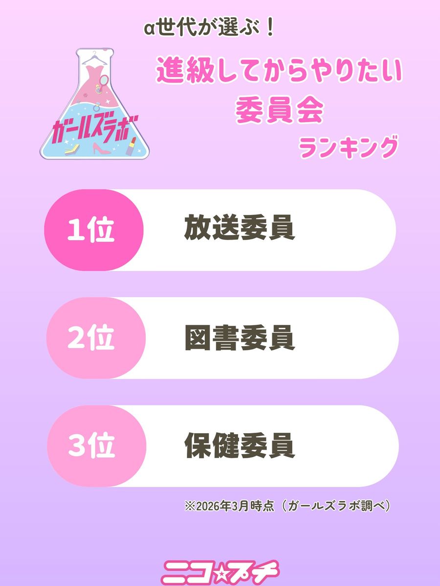 1位は放送委員♡ 学校全体に向けた放送は、緊張するけど楽しいはず! やりたい委員会を考えるだけでも、新学期への期待がふくらむね☆
