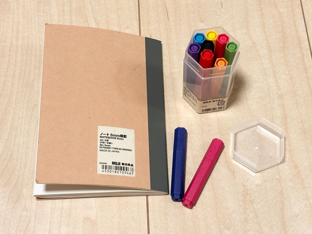 まずは無印のカラーペンセットとノート!両方ともミニサイズで持ち歩きに便利👍
