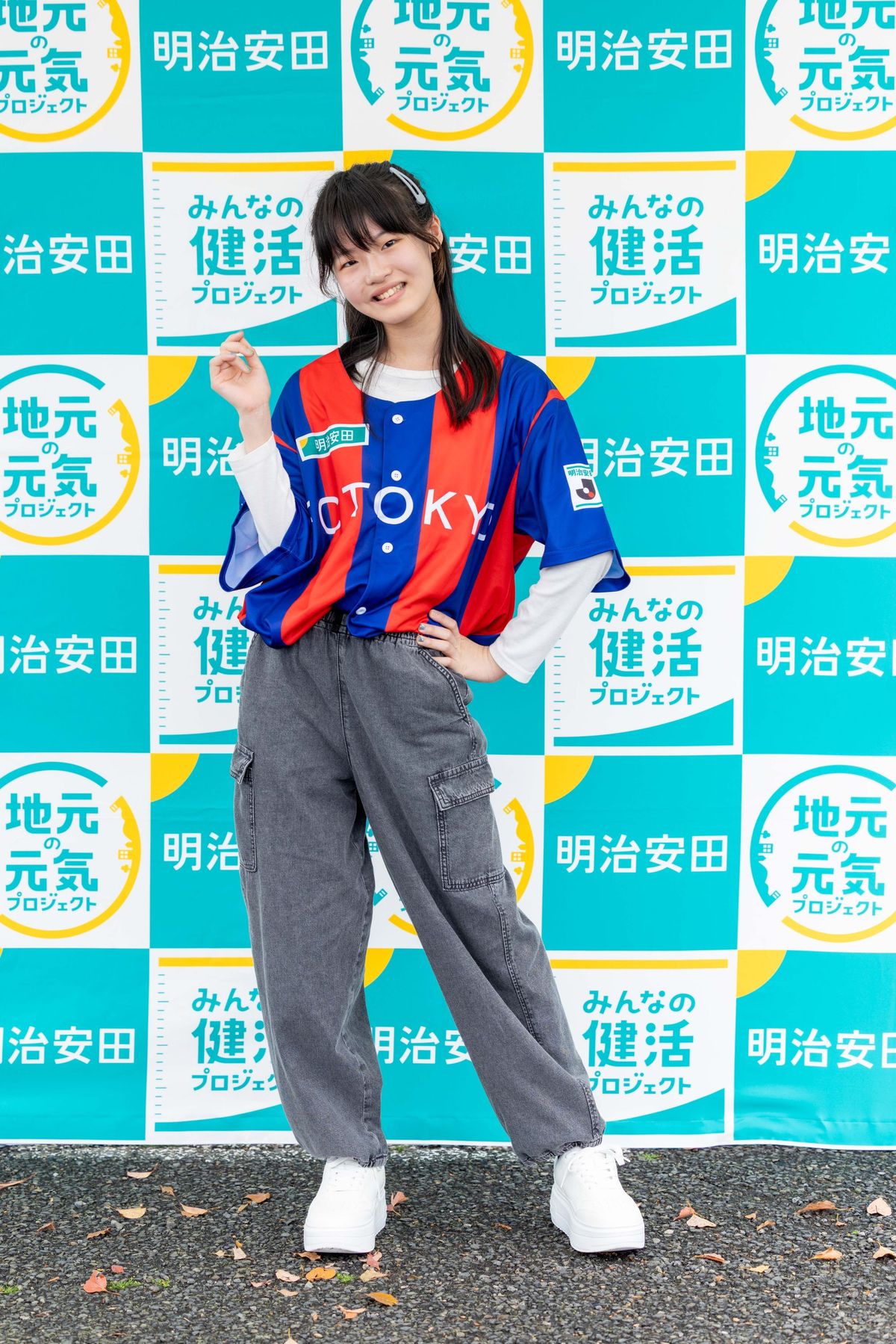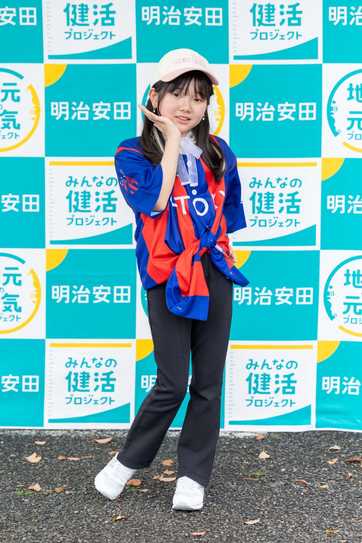 赤や青をふんだんに使ってクールに☆ ボトムスはまっさらな白のバルーンスカートで、ユニフォームをさらに映えさえるよ!りおなちゃん(小6)