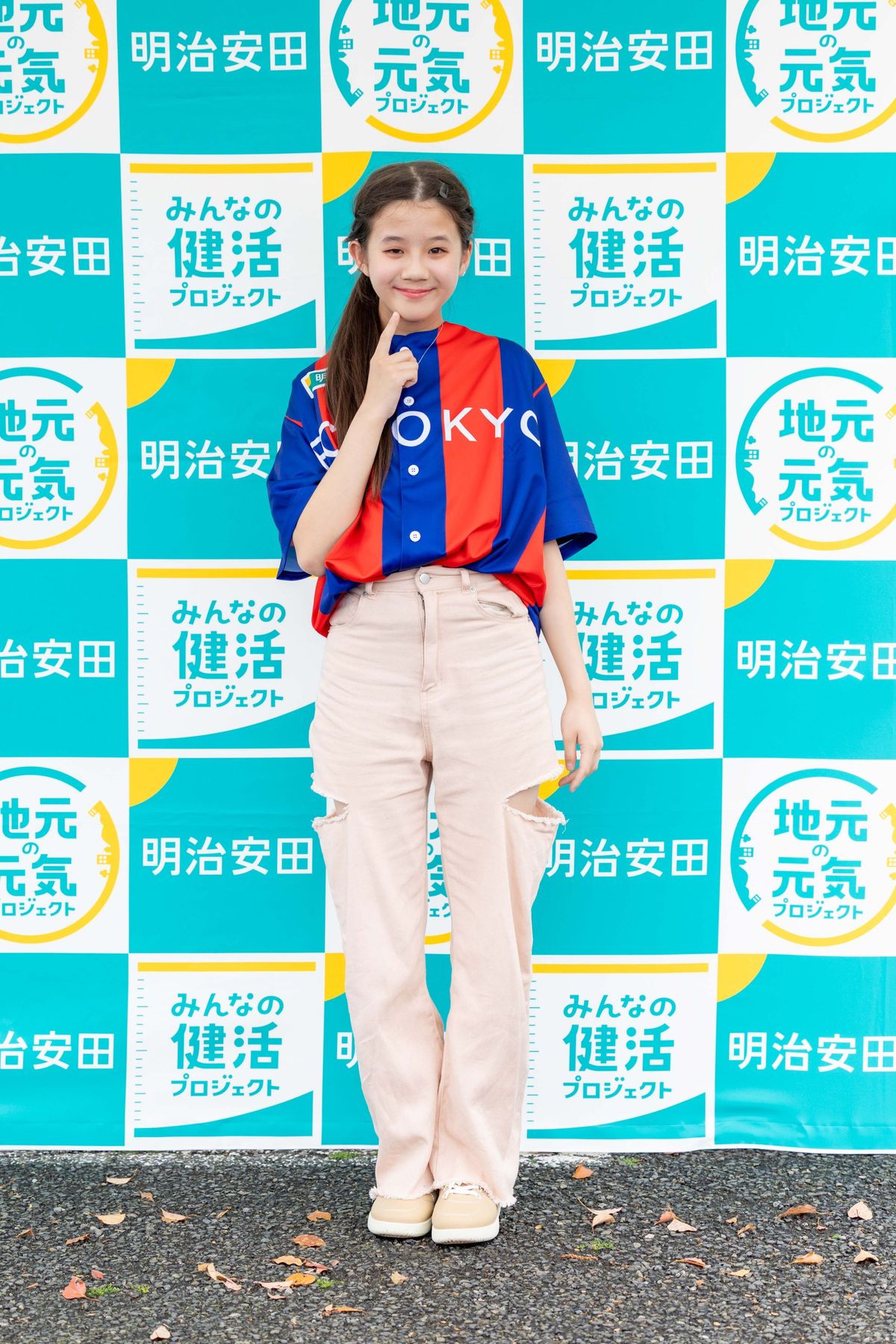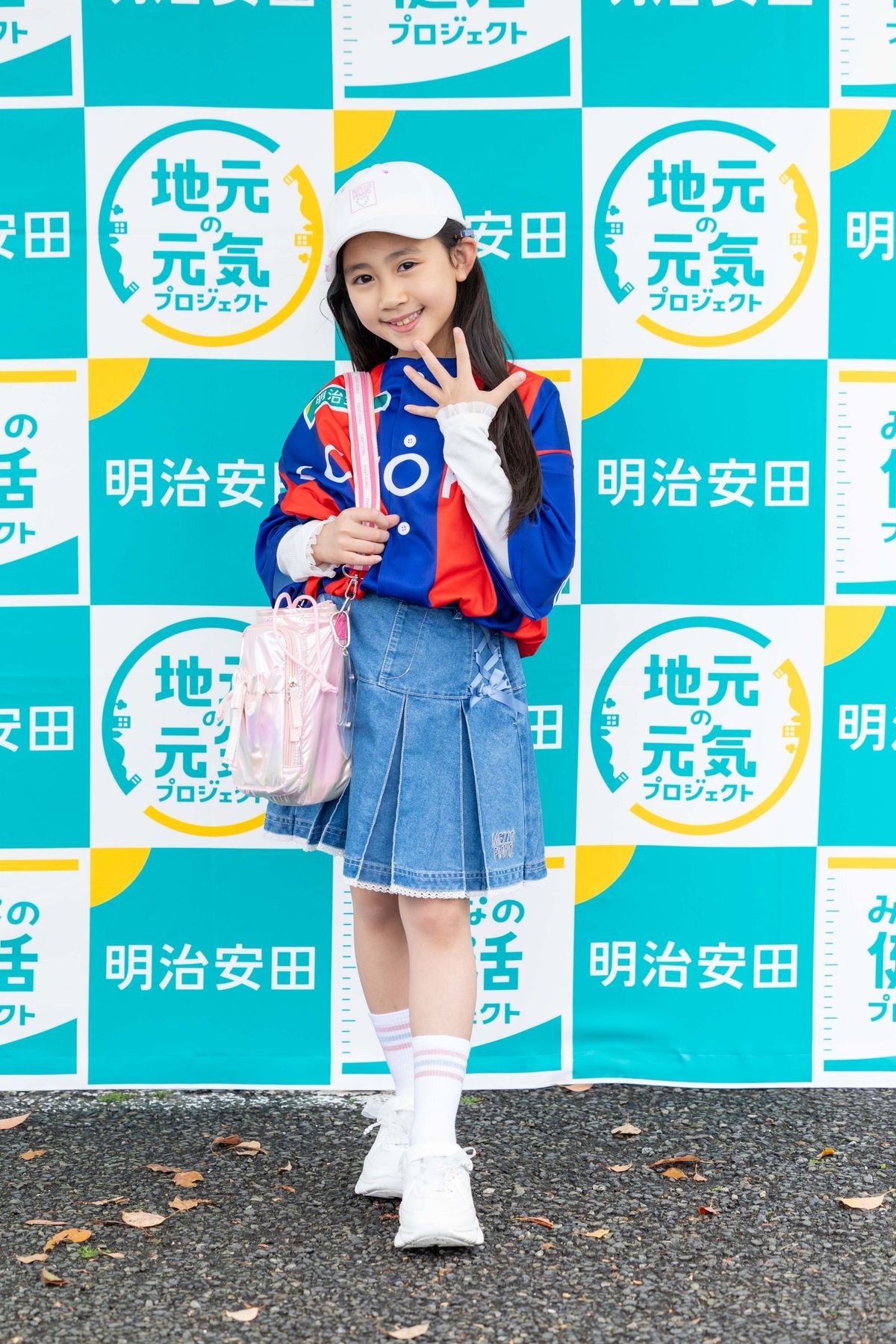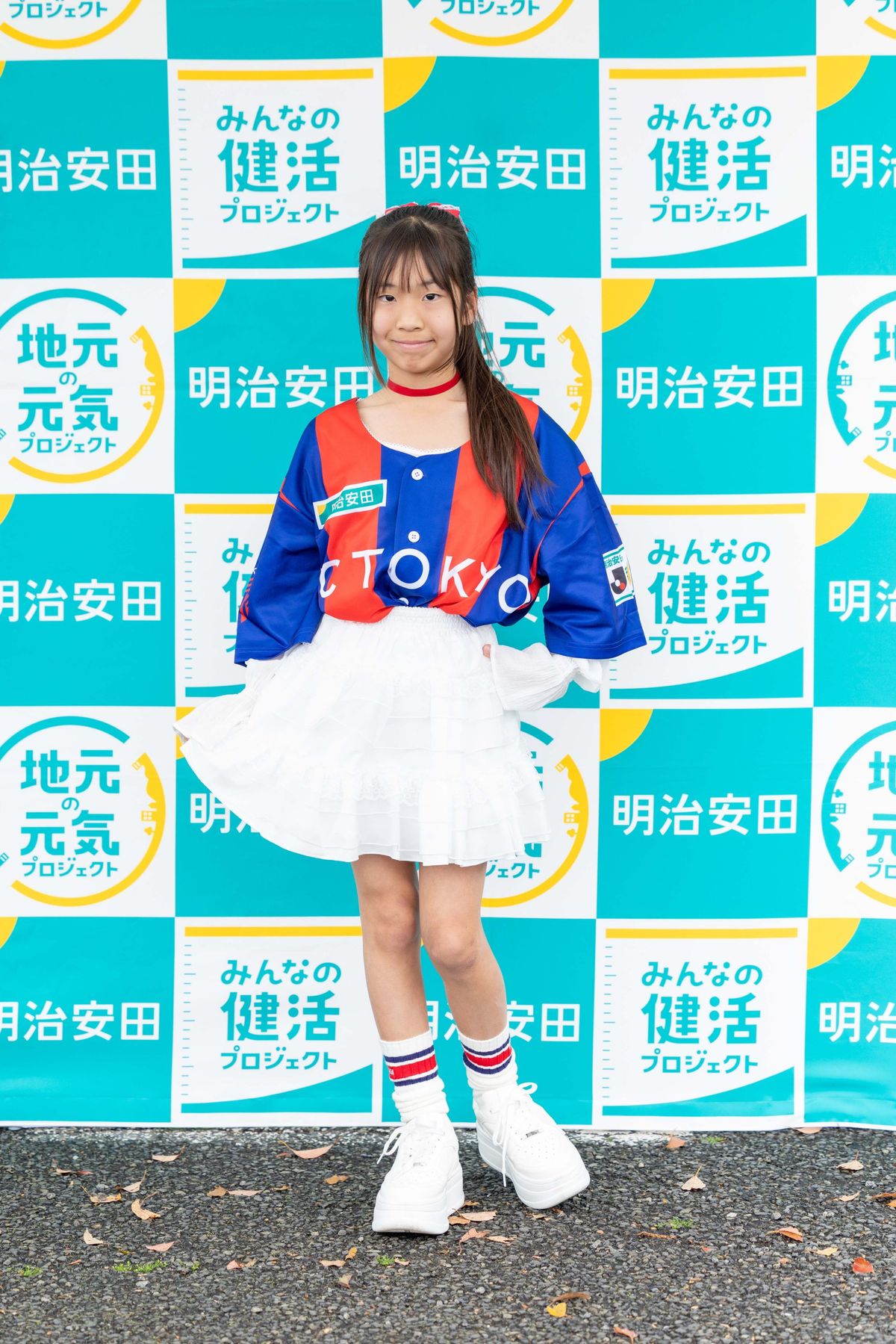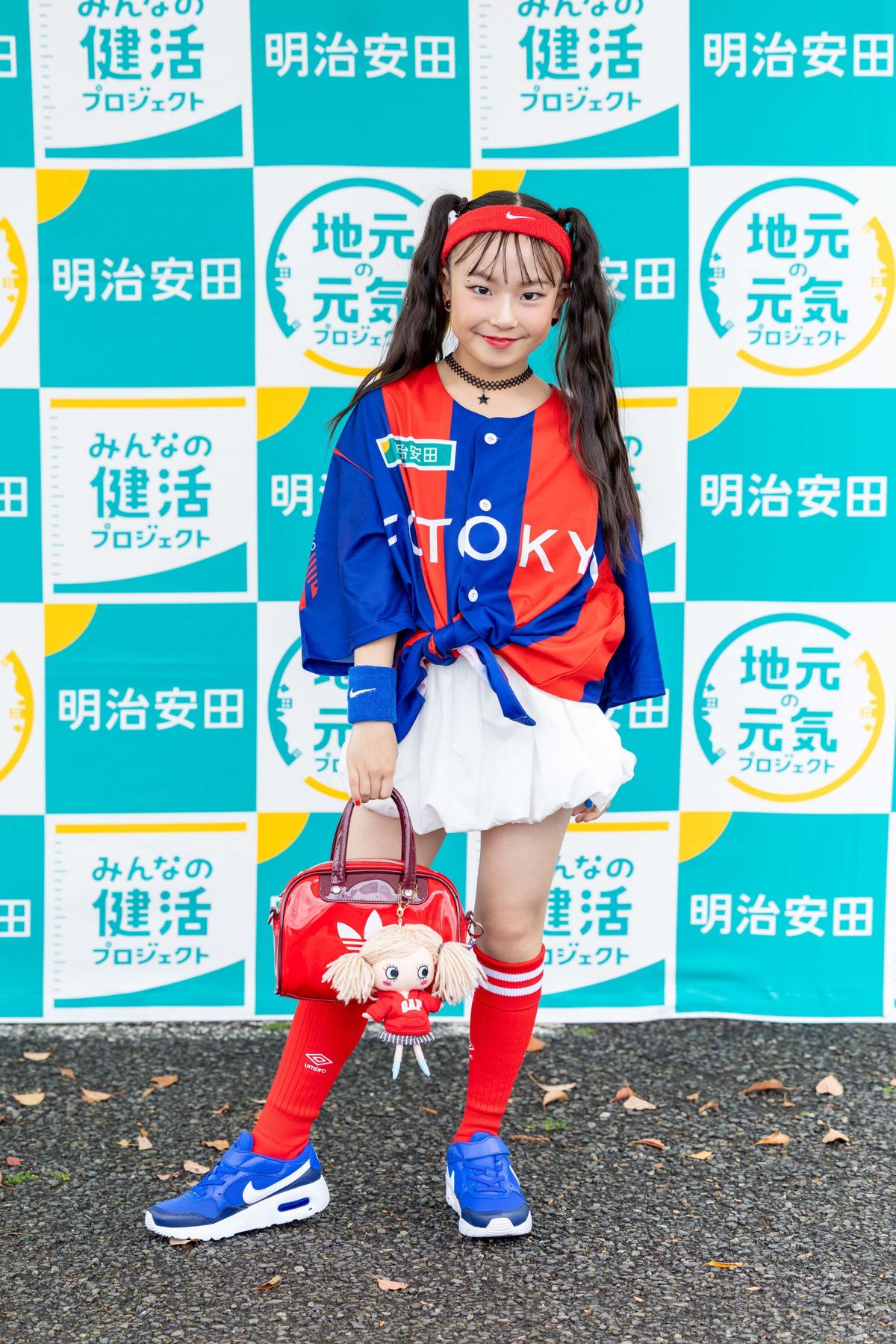 ピンクのダメージデニムを使った春のサッカー観戦コーデ♡ おしゃれをして、だいすきなFC東京をもりあげるよ〜!リサちゃん(小3)