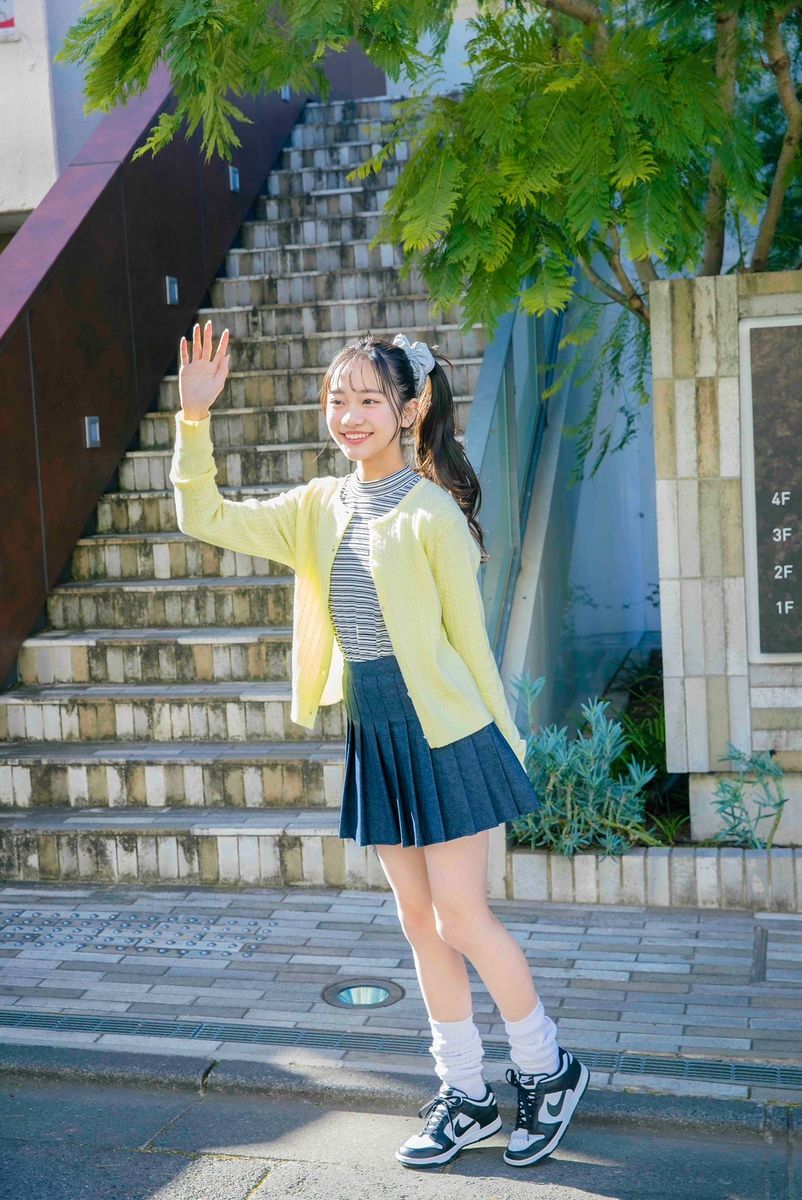 気温差が大きい春コーデは羽おりアイテムが必須。中に着るトップスの使い分けがポイントだよ!ちひな☆ カーディガン¥2990/アンユアエイニー(グローバルワーク) トップス¥2750/ジディー スカート¥3590/URBAN CHERRY シュシュ¥660/パリスキッズ原宿本店 ソックス¥1540/靴下や(タビオ)スニーカー¥1540/ナイキスポーツウェア