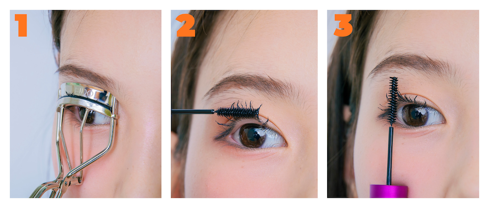 ①ビューラーでまつ毛を上げる。まつ毛の根元→中間→毛先の順に、ビューラーをすべらせながらやさしくはさんでね。手首だけじゃなくて、腕全体で角度をつけると、キレイなカールになるよ!
