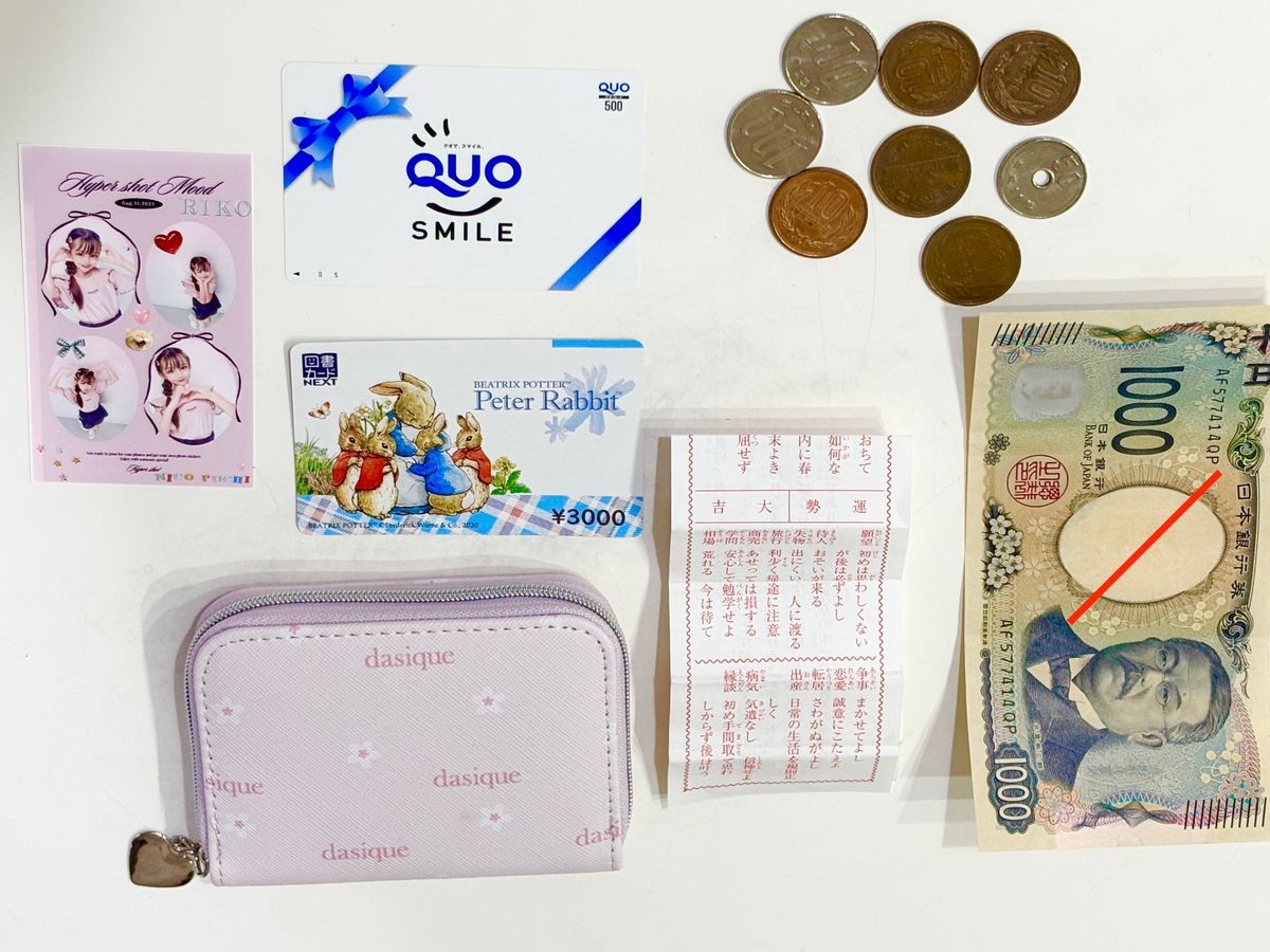 リコのおさいふには、運気をあげるおみくじや1人プリなど、いろんなものが入っていたよ♪
