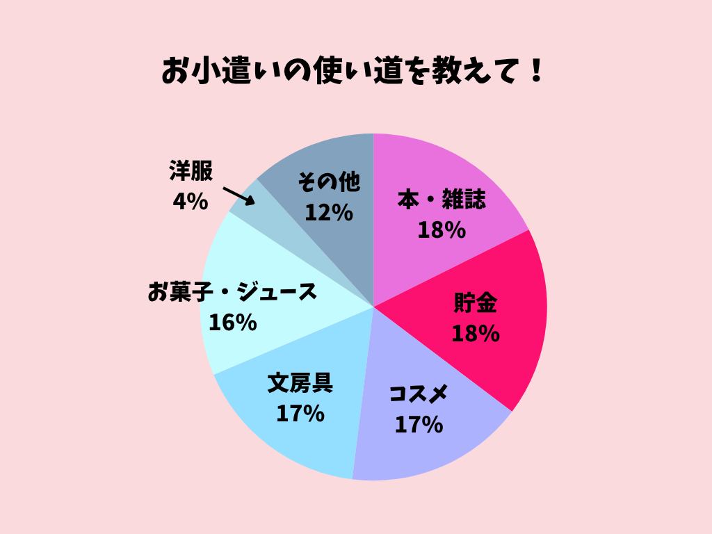 文房具、貯金といった堅実な使い方が上位に上がる一方で、コスメやお菓子・ジュースなど、自分の楽しみに使う傾向がわかりました。全体として、必要なものと楽しみの両方にバランスよく使っている様子が伺えます。その他の回答では、プリ撮影など友だちとの遊びや、推し活、カプセルトイといった趣味に使うという声も多く見られました。