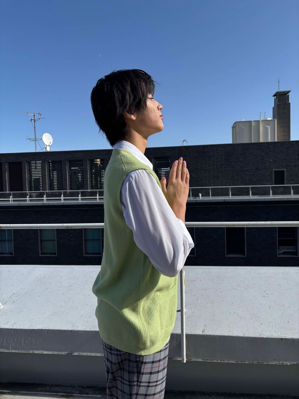 こちらはメン㋲のハル。なぜか真っ青な空に向かって合掌。なんで〜?!(笑)