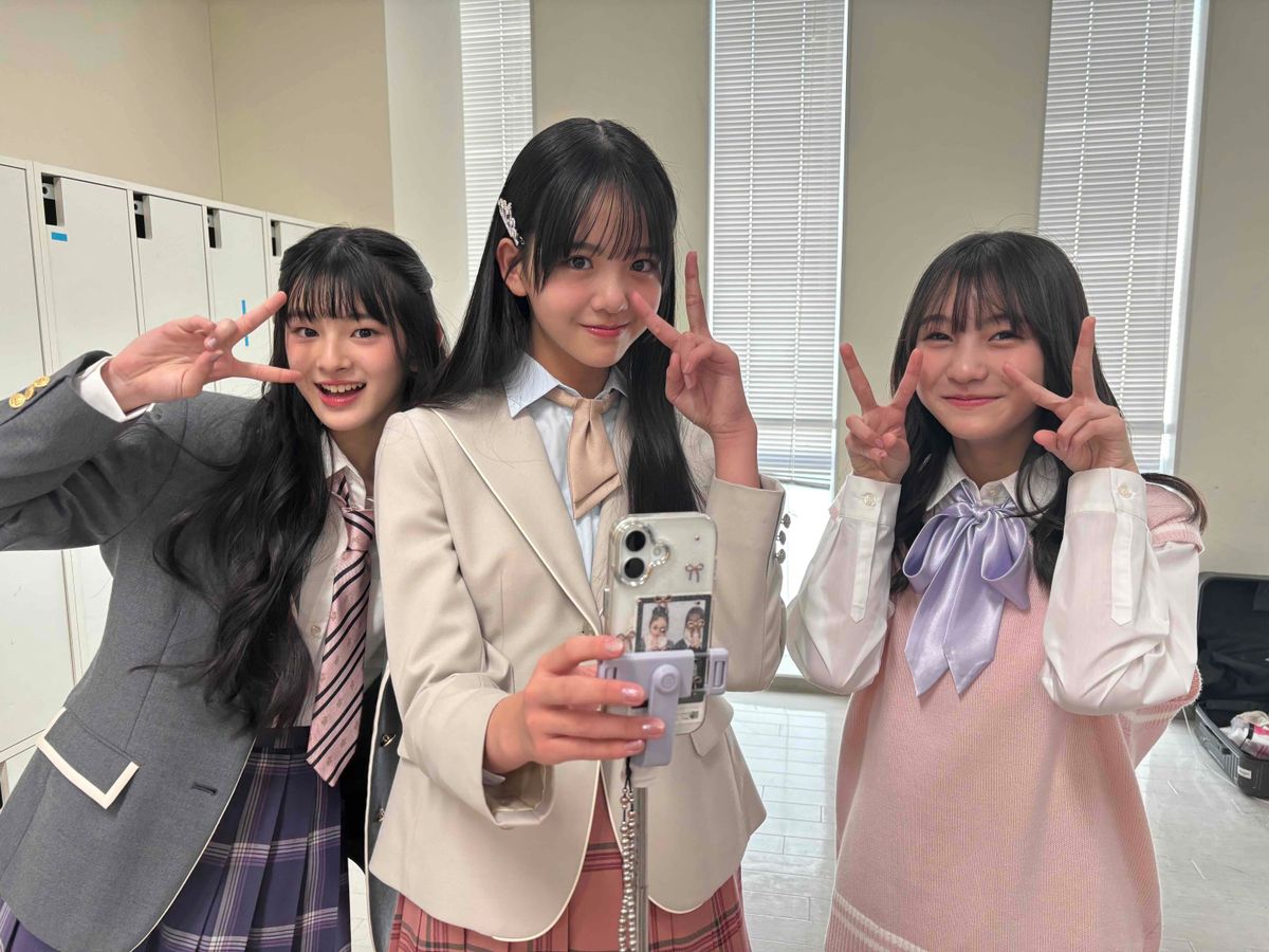 アイドルっぽい制服のヒナちゃん、リサ、ミレイ♡ スマホで自撮りをしているところをきゃーっち!